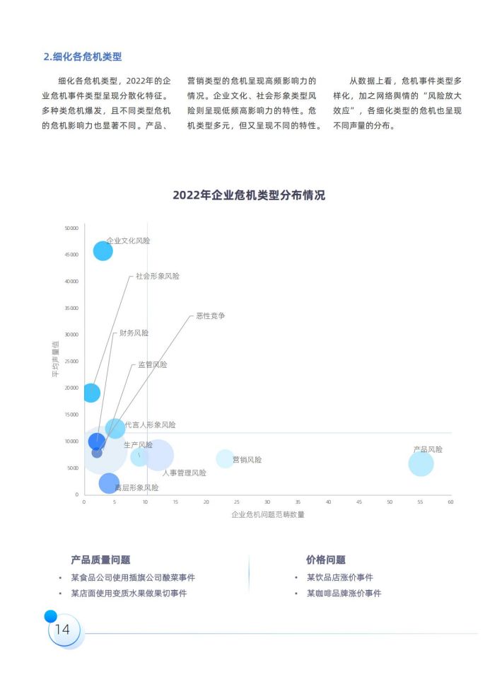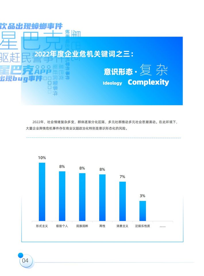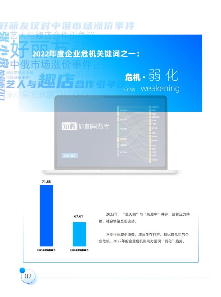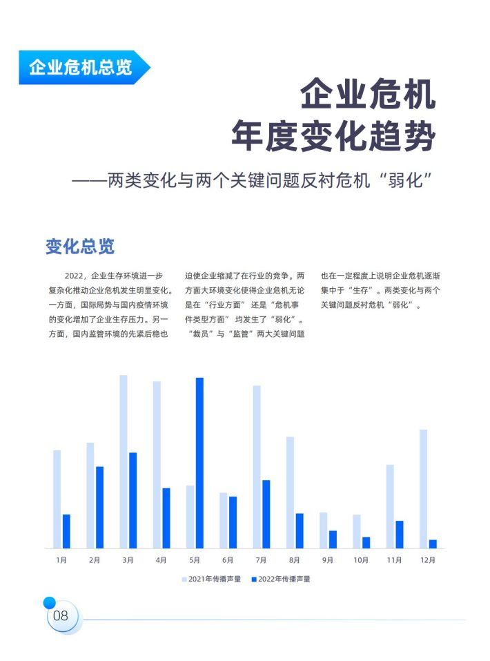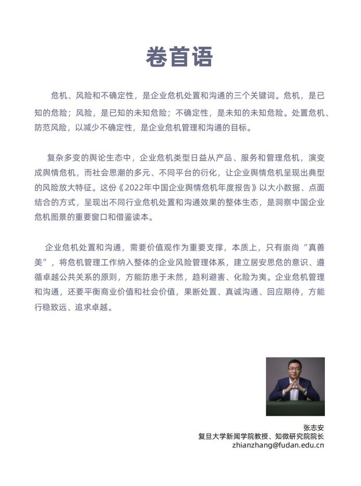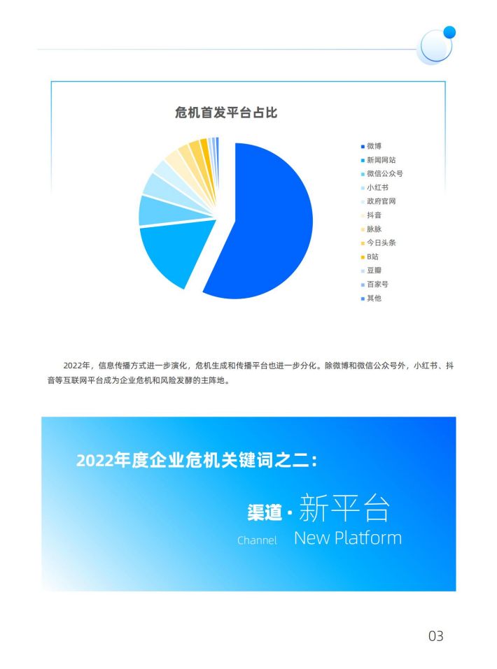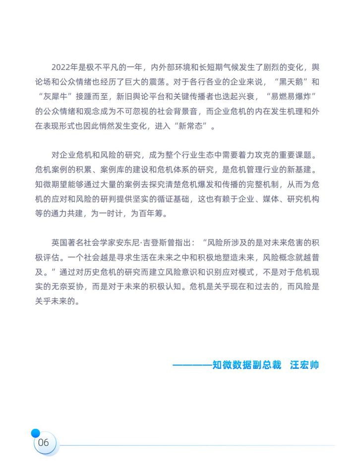复杂多变的舆论生态中,企业危机类型日益从产品、服务和管理危机,演变成舆情危机,而社会思潮的多元、不同平台的衍化,让企业舆情危机呈现出典型的风险放大特征。这份《2022年中国企业舆情危机年度报告》以大小数据、点面结合的方式,呈现出不同行业危机处置和沟通效果的整体生态,是洞察中国企业危机图景的重要窗口和借鉴读本。
