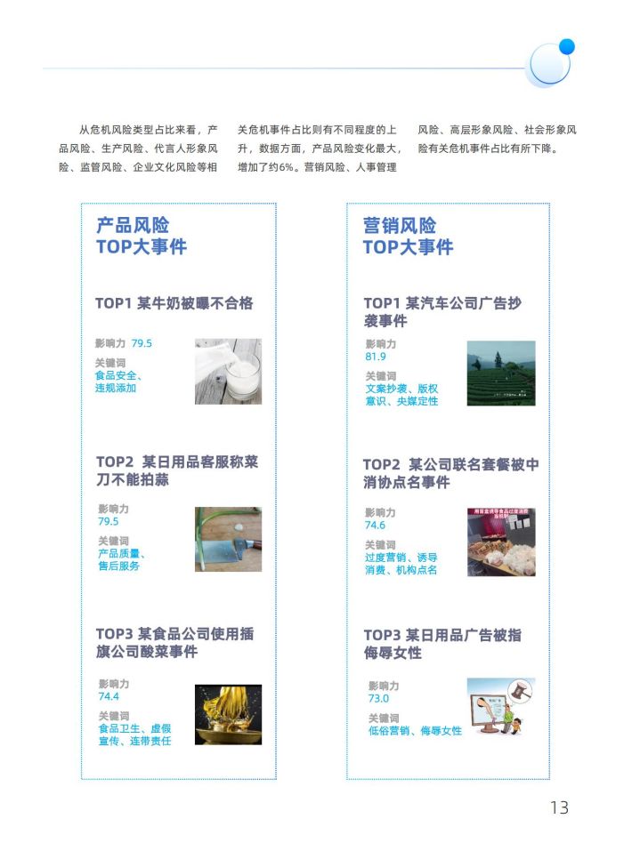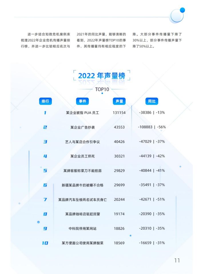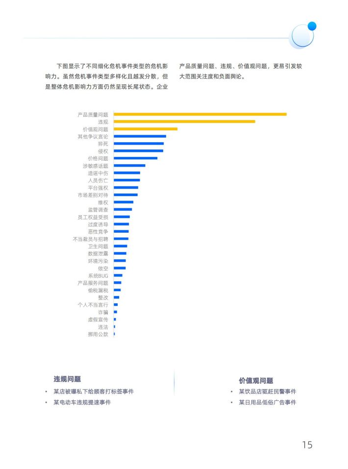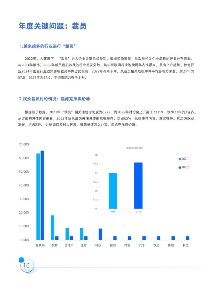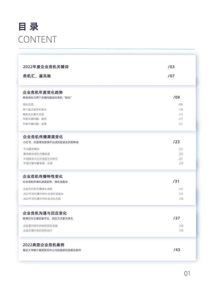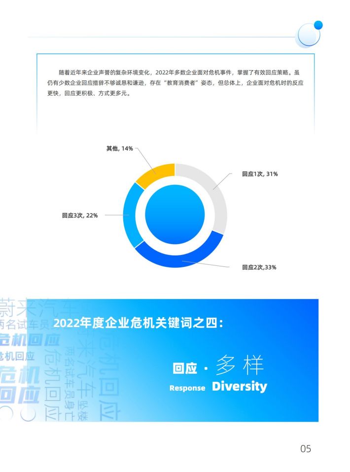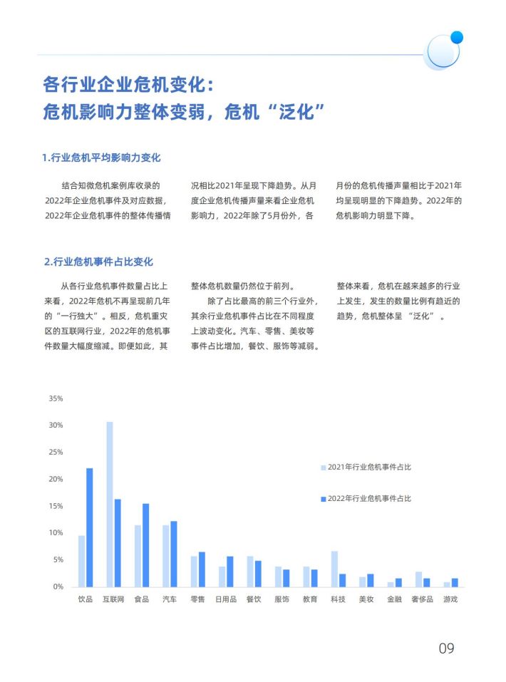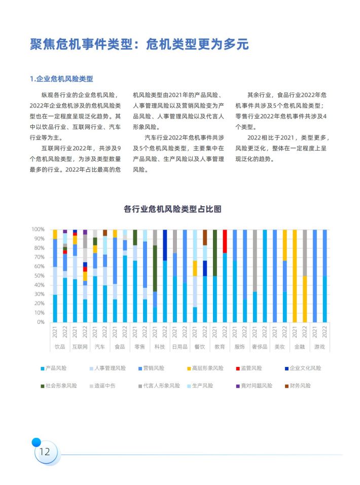 复杂多变的舆论生态中,企业危机类型日益从产品、服务和管理危机,演变成舆情危机,而社会思潮的多元、不同平台的衍化,让企业舆情危机呈现出典型的风险放大特征。这份《2022年中国企业舆情危机年度报告》以大小数据、点面结合的方式,呈现出不同行业危机处置和沟通效果的整体生态,是洞察中国企业危机图景的重要窗口和借鉴读本。