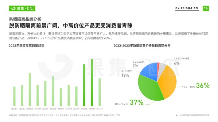 防晒产品价格带分布较广,一般分为经济型、中档和高端三个价格带。其中,经济型防晒产品的价格一般在55元以下,中档防晒产品价格在55-229元之间,高端防晒产品价格一般在229元以上。从各价格段的增长趋势来看,经济型防晒产品相对较为经济实惠,适合大众消费群体,因此增幅最为明显,尤其是36.9-55元的防晒产品,以同比增长282%成为2022年销售增幅最高的区间。