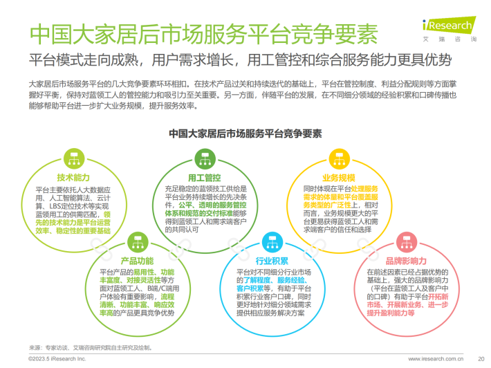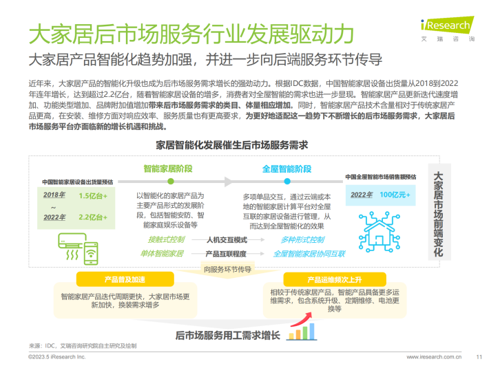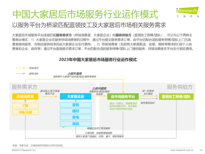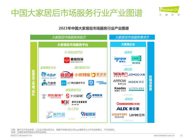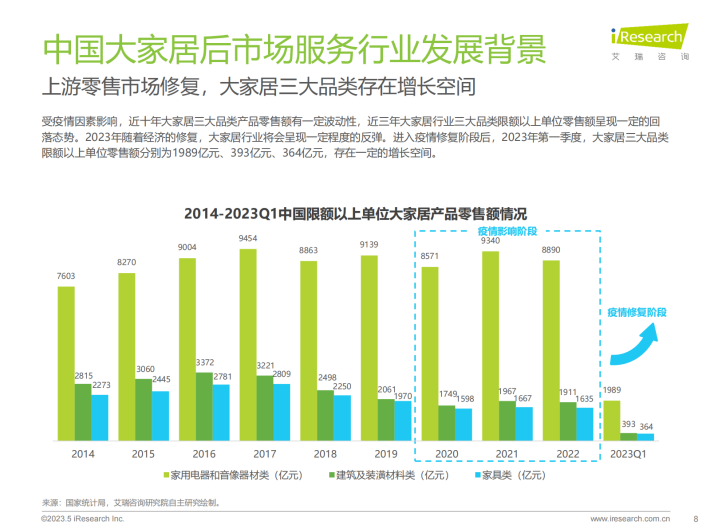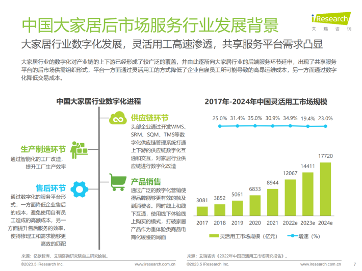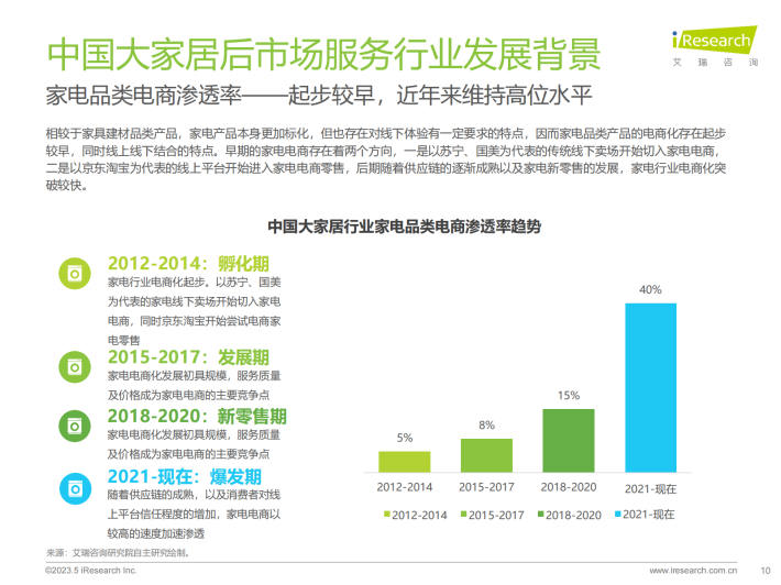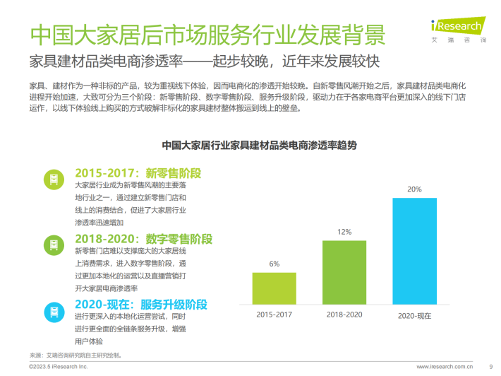 产品处于更新换代期,后市场服务需求高。数字化高速发展,灵活用工高速渗透疫情后上游零售市场走向修复阶段,家具、建材、家电三大品类开始疫情后消费反弹大家居电商化程度逐年增长,零售渠道扩张,智能家居渗透,催生后市场服务需求