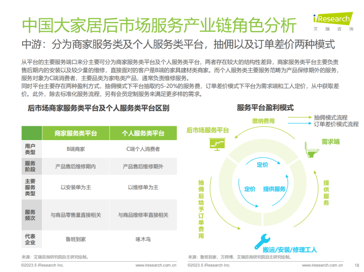 中游:主要分为商家服务类平台及个人服务类平台,盈利模式包括抽佣模式及订单差价模式