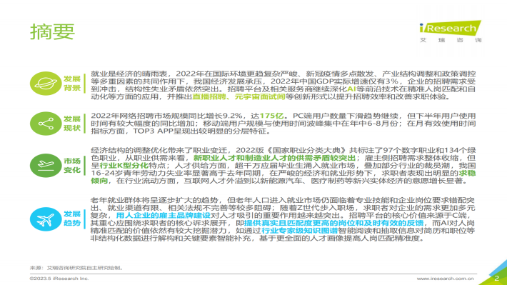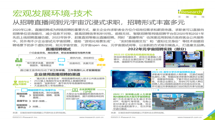 就业是经济的晴雨表,2022年在国际环境更趋复杂严峻、新冠疫情多点散发、产业结构调整和政策调控等多重因素的共同作用下,我国经济发展承压,2022年中国GDP实际增速仅有3%,企业的招聘需求受到冲击,结构性失业矛盾依然突出。招聘平台及相关服务商继续深化Al等前沿技术在精准人岗匹配和自动化等方面的应用,并推出直播招聘、元宇宙面试间等创新形式以提升招聘效率和改善求职体验。