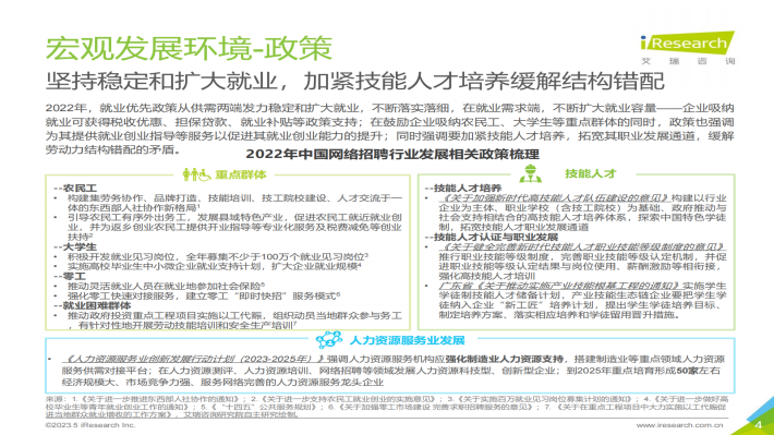 经济结构的调整优化带来了职业变迁,2022版《国家职业分类大典》共标注了97个数字职业和134个绿色职业,从职业供需来看,新职业人才和制造业人才的供需矛盾较突出;雇主侧招聘需求整体收缩,但呈行业K型分化特点;人才供给方面,超千万应届毕业生涌入就业市场,叠加部分行业的裁员潮,我国16-24岁青年劳动力失业率显著高于去年同期,在严峻的经济和就业形势下,求职者表现出明显的求稳倾向,在行业流动方面,互联网人才外溢到以新能源汽车、医疗制药等新兴实体经济的意愿增长显著。