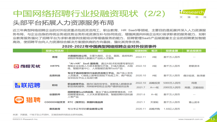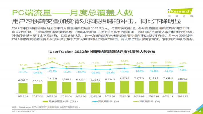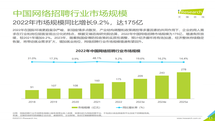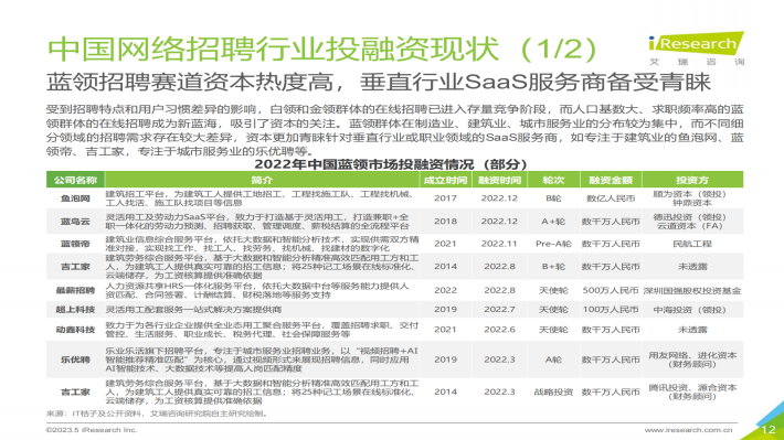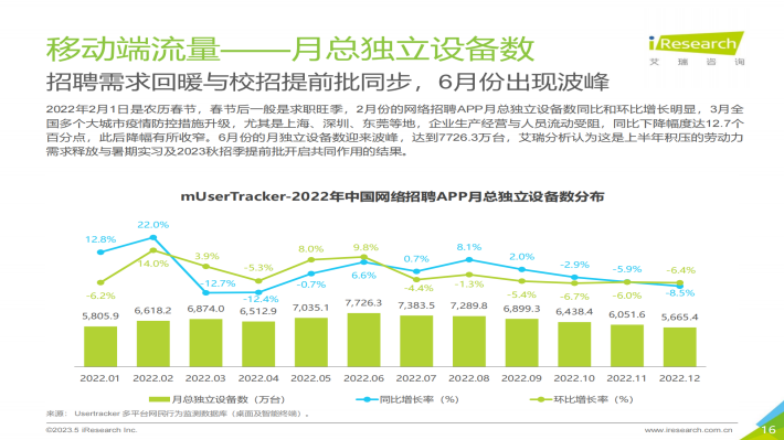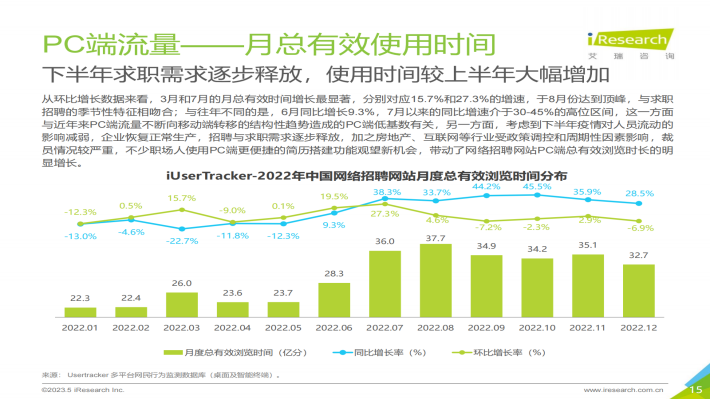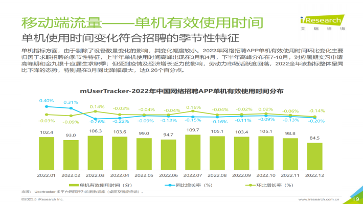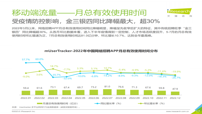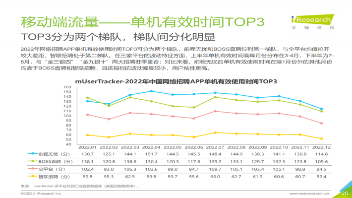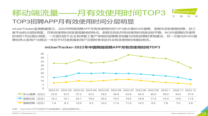 2022年网络招聘市场规模同比增长9.2%,达175亿。PC端用户数量下滑趋势继续,但下半年用户使用时间有较大幅度的同比增加;移动端用户规模与使用时间波峰集中在年中6-8月份;在月有效使用时间指标方面,TOP3 APP呈现出较明显的分层特征。