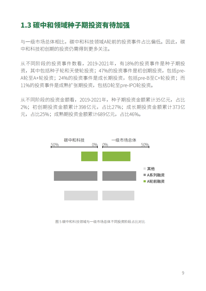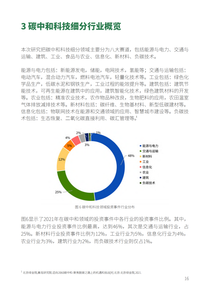为进一步研究碳中和科技领域投资的结构特征和行业趋势,本报告将碳中和科技领域细化为八个方向:能源与电力、交通与运输、工业、建筑、农业、新材料、信息化、负碳技术。我们发现,在这八个细分方向中,碳中和科技领域的投资较为集中地投向了能源和交通这两个方向。2021年,能源、交通方向获得的投资最多,这两个方向的投资事件数占碳中和科技领域投资事件总数超过75%的比例,投资金额占比超过90%。工业、建筑、农业等方向有不亚于能源及交通领域的减碳效益,但目前相对来说并没有得到同等级别的关注和投资,随着这些方向行业政策的不断出台以及行业内低碳技术的逐渐成熟,工业、建筑和农业等行业的创新企业也值得投资者更多关注。我们还发现,一些持续关注碳中和科技领域的投资机构,已经深入碳中和科技领域更细分、产业链更细节的地方去挖掘项目,寻找估值更加合理、成长更为确定的投资标的,规避热门赛道过于拥挤、估值虚高的风险。