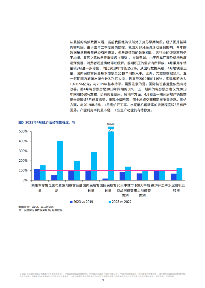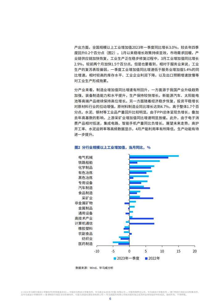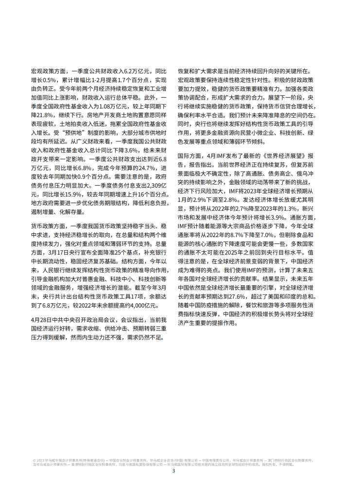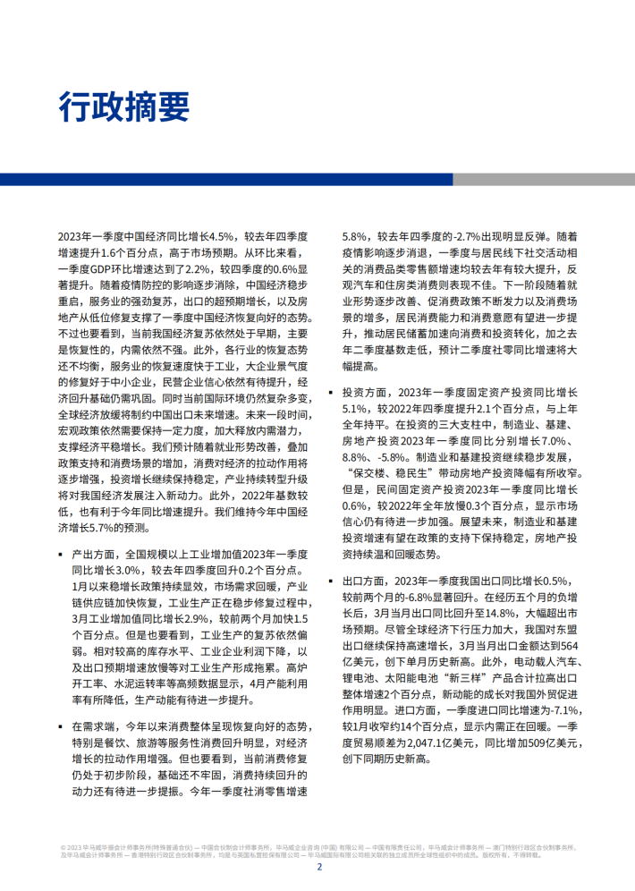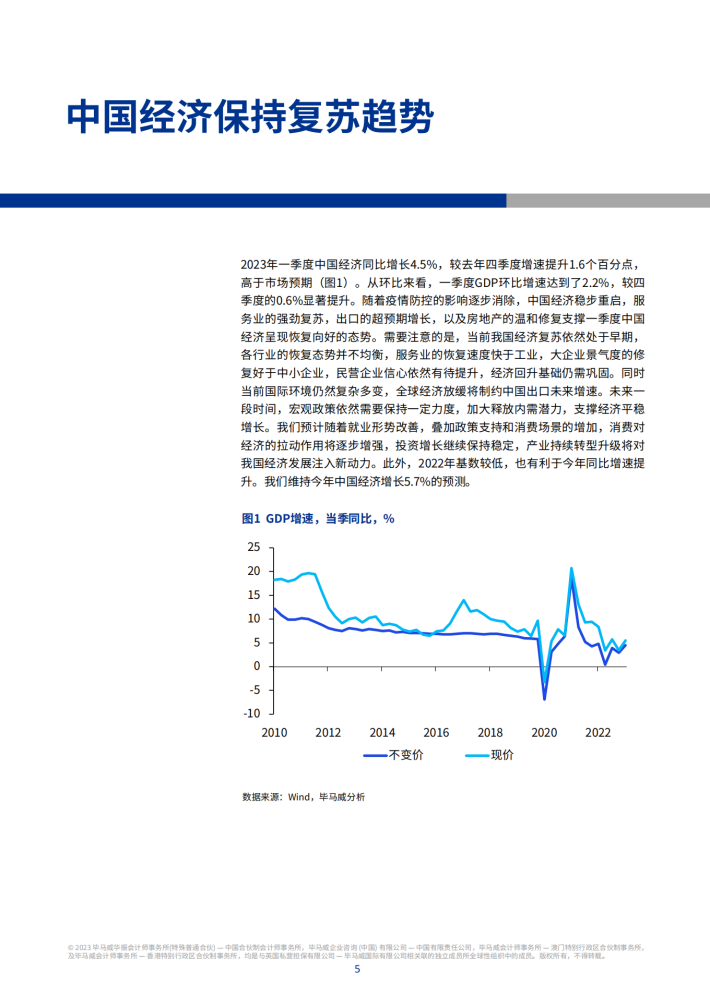 2023年一季度中国经济同比增长4.5%,较去年四季度增速提升1.6个百分点,高于市场预期。从环比来看,一季度GDP环比增速达到了2.2%,较四季度的0.6%显著提升。随着疫情防控的影响逐步消除,中国经济稳步重启,服务业的强劲复苏,出口的超预期增长,以及房地产从低位修复支撑了一季度中国经济恢复向好的态势。不过也要看到,当前我国经济复苏依然处于早期,主要是恢复性的,内需依然不强。此外,各行业的恢复态势还不均衡,服务业的恢复速度快于工业,大企业景气度的修复好于中小企业,民营企业信心依然有待提升,经济回升基础仍需巩固。同时当前国际环境仍然复杂多变,全球经济放缓将制约中国出口未来增速。未来一段时间,宏观政策依然需要保持一定力度,加大释放内需潜力,支撑经济平稳增长。我们预计随着就业形势改善,叠加政策支持和消费场景的增加,消费对经济的拉动作用将逐步增强,投资增长继续保持稳定,产业持续转型升级将对我国经济发展注入新动力。此外,2022年基数较低,也有利于今年同比增速提升。我们维持今年中国经济增长5.7%的预测。