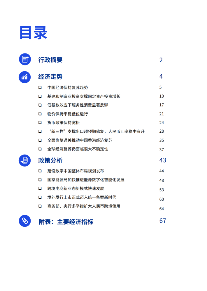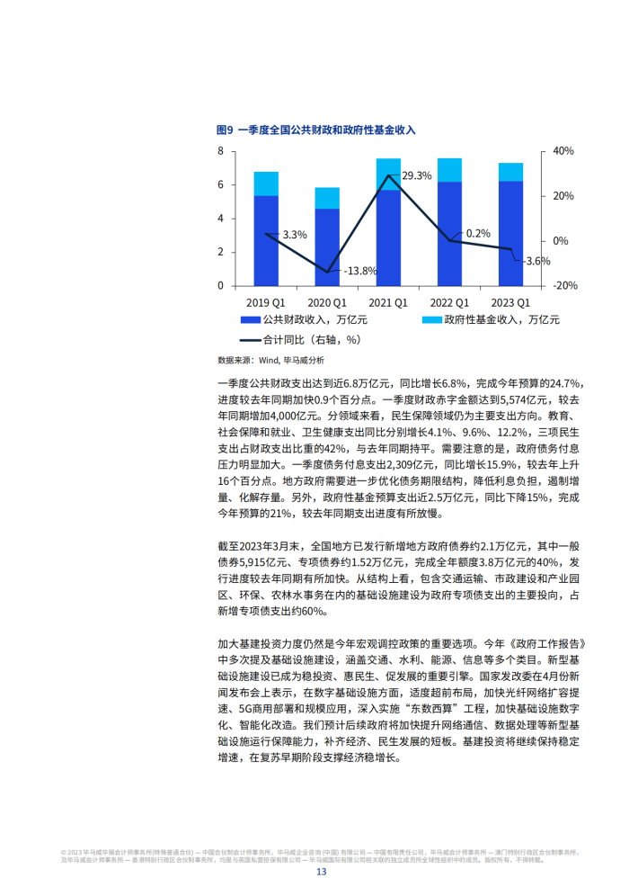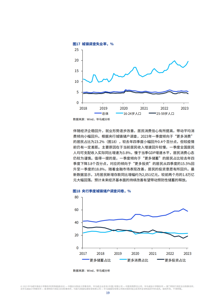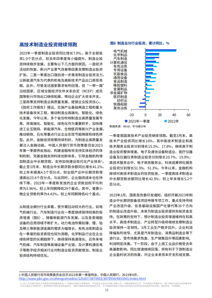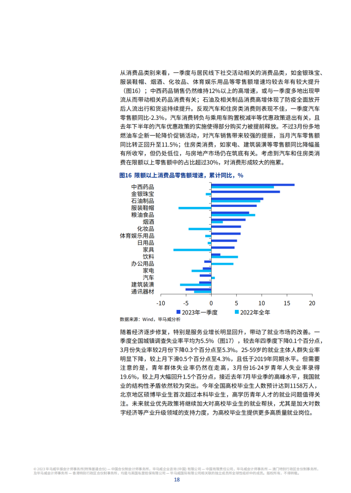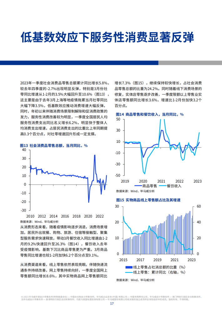 2023年一季度中国经济同比增长4.5%,较去年四季度增速提升1.6个百分点,高于市场预期。从环比来看,一季度GDP环比增速达到了2.2%,较四季度的0.6%显著提升。随着疫情防控的影响逐步消除,中国经济稳步重启,服务业的强劲复苏,出口的超预期增长,以及房地产从低位修复支撑了一季度中国经济恢复向好的态势。不过也要看到,当前我国经济复苏依然处于早期,主要是恢复性的,内需依然不强。此外,各行业的恢复态势还不均衡,服务业的恢复速度快于工业,大企业景气度的修复好于中小企业,民营企业信心依然有待提升,经济回升基础仍需巩固。同时当前国际环境仍然复杂多变,全球经济放缓将制约中国出口未来增速。未来一段时间,宏观政策依然需要保持一定力度,加大释放内需潜力,支撑经济平稳增长。我们预计随着就业形势改善,叠加政策支持和消费场景的增加,消费对经济的拉动作用将逐步增强,投资增长继续保持稳定,产业持续转型升级将对我国经济发展注入新动力。此外,2022年基数较低,也有利于今年同比增速提升。我们维持今年中国经济增长5.7%的预测。
