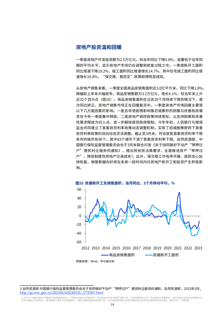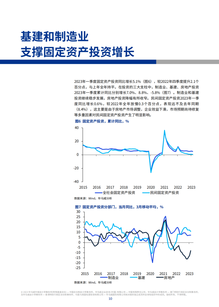 投资方面,2023年一季度固定资产投资同比增长5.1%,较2022年四季度提升2.1个百分点,与上年全年持平。在投资的三大支柱中,制造业、基建、房地产投资2023年一季度同比分别增长7.0%、8.8%、-5.8%。制造业和基建投资继续稳步发展,“保交楼、稳民生”带动房地产投资降幅有所收窄。但是,民间固定资产投资2023年一季度同比增长0.6%,较2022年全年放慢0.3个百分点,显示市场信心仍有待进一步加强。展望未来,制造业和基建投资增速有望在政策的支持下保持稳定,房地产投资持续温和回暖态势。
