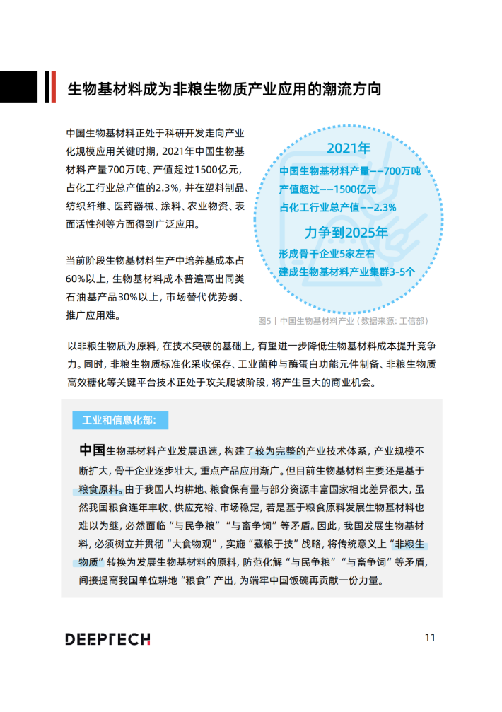 2023年1月,工信部等六部门印发《加快非粮生物基材料创新发展三年行动方案》,提出到2025年,非粮生物基材料产业基本形成自主创新能力强、产品体系不断丰富、绿色循环低碳的创新发展生态,非粮生物质原料利用和应用技术基本成熟,部分非粮生物基产品竞争力与化石基产品相当,高质量、可持续的供给和消费体系初步建立。