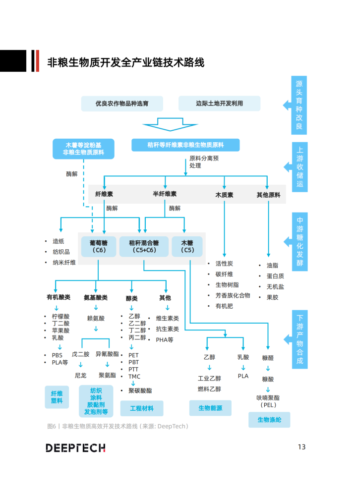 以非粮生物质为原料通过发酵的手段生产生物基材料,既是对秸秆等生物质高附加值的利用,也有力支撑“双碳”战略目标的实现。当前,生物基材料已形成一定市场规模、产业链已初步形成,但非粮生物质的开发尚未实现大规模技术突破,产业升级迭代潜力巨大。非粮生物质的开发有望成为生物基材料降本增效的关键环节,基于非粮碳源、通过发酵或催化实现生物基产品对石化基产品的替代和升级,成为提升生物基产品市场竞争力的重要途径。
