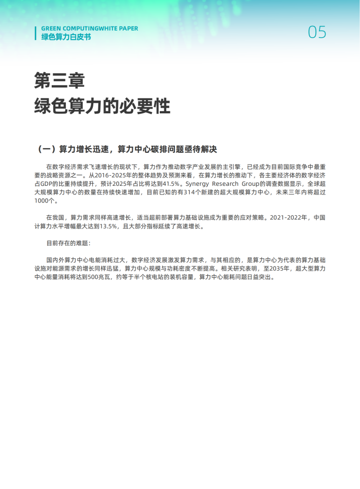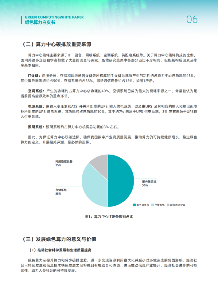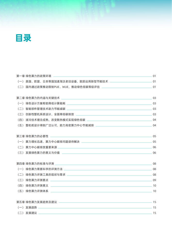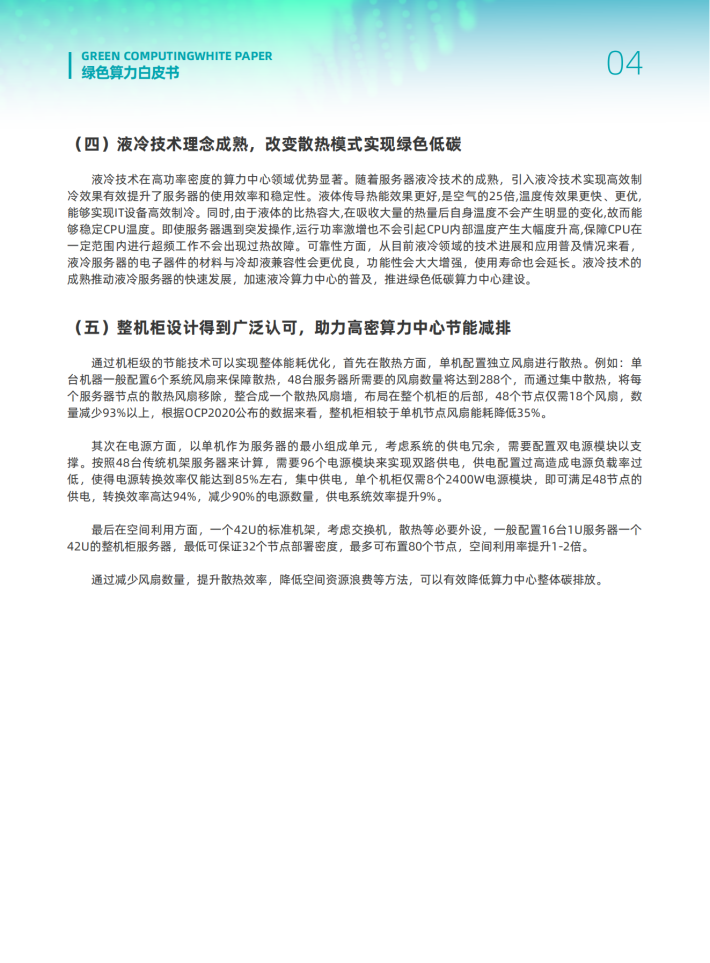 IT设备是数据中心能耗的最主要部分,占比高达50%以上,其算效水平直接决定能耗水平,目前我国数据中心的平均计算效率与国际先进水平相比还有差距。要实现数据中心绿色升级,不仅表现在降低能耗,也意味着提升服务器的计算效率。一方面需要创新整机系统设计,减少部件、整机散热产生的电力消耗,提升用能效率;另一方面也要推动加快液冷等高效制冷系统的技术产品应用,加速液冷算力中心的普及,推进绿色低碳算力中心建设。
