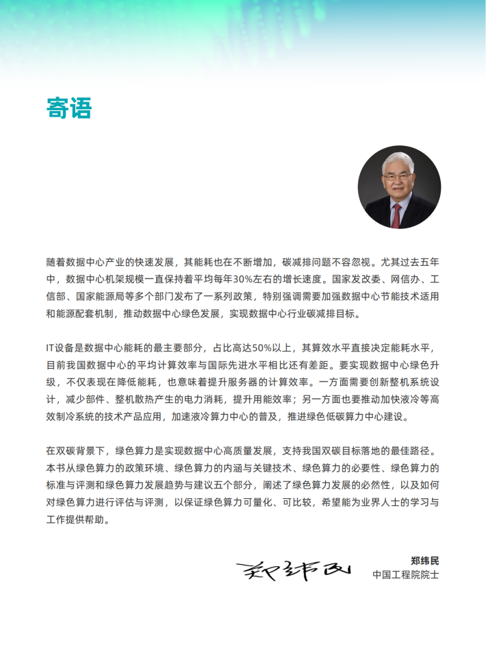 在双碳背景下,绿色算力是实现数据中心高质量发展,支持我国双碳目标落地的最佳路径。本书从绿色算力的政策环境、绿色算力的内涵与关键技术、绿色算力的必要性、绿色算力的标准与评测和绿色算力发展趋势与建议五个部分,阐述了绿色算力发展的必然性,以及如何对绿色算力进行评估与评测,以保证绿色算力可量化、可比较,希望能为业界人士的学习与工作提供帮助。