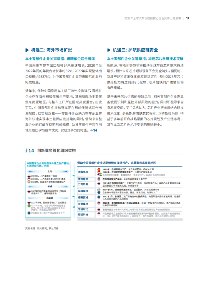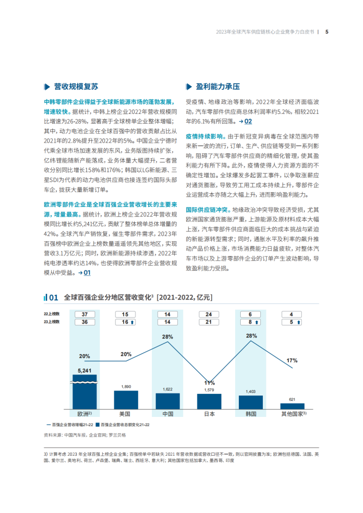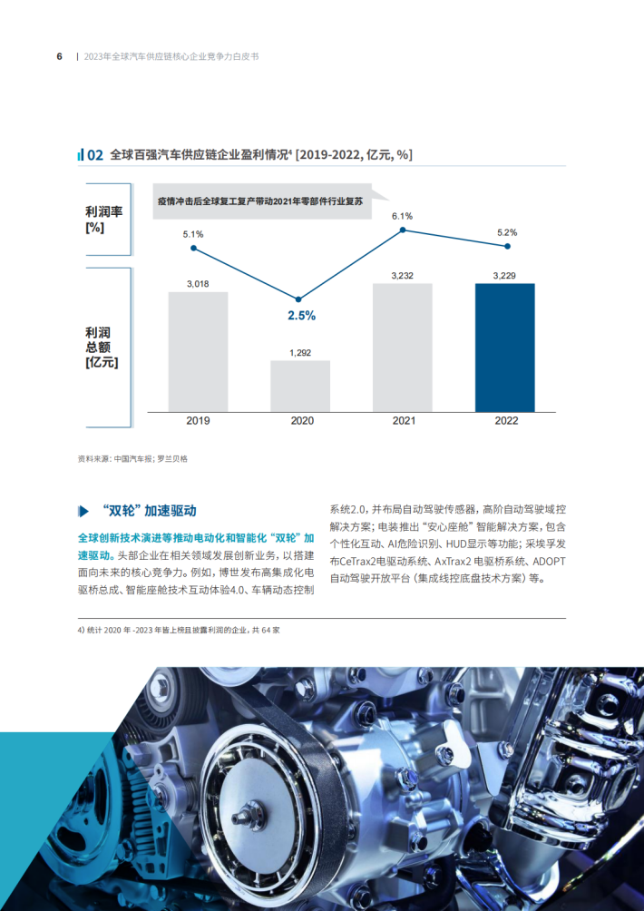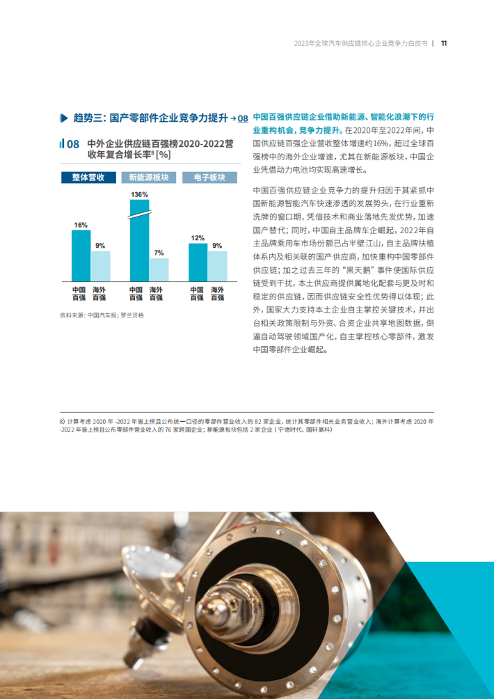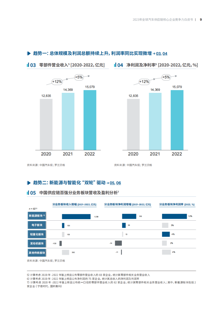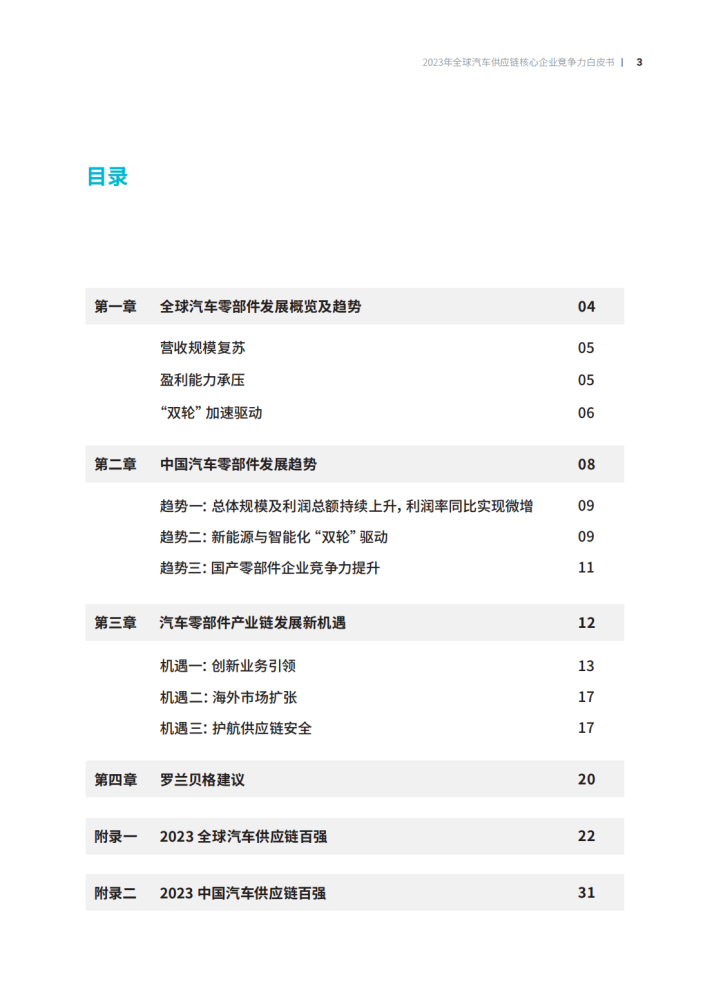 本报告通过分析全球与中国汽车及零部件行业发展现状及趋势,基于2021年和2022年百强企业营收、盈利及研发等数据信息,解析中外零部件百强企业的三大核心发展趋势。同时,报告结合行业发展大势,指出企业致胜未来的三大新机遇,并提出关键举措与战略思辨方向。