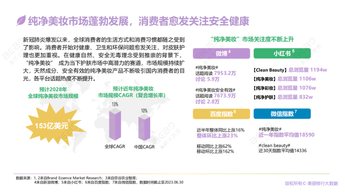 新冠肺炎爆发以来,全球消费者的生活方式和消费习惯都随之受到了影响。消费者开始对健康、卫生和环保问题愈发关注,对皮肤护理也更加重视。在健康自然、安全无毒理念受到推崇的背景下,“纯净美妆” 成为当下护肤市场中高潜力的赛道,市场规模持续扩大,天然成分、安全有效的纯净美妆产品不断吸引国内消费者的目光,各平台话题热度不断提升。