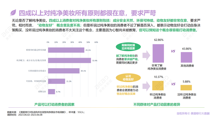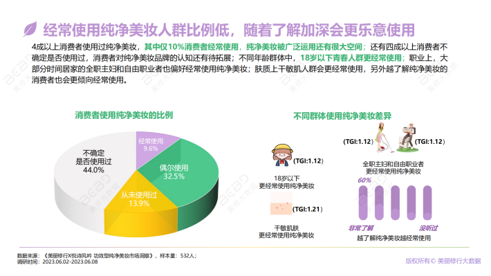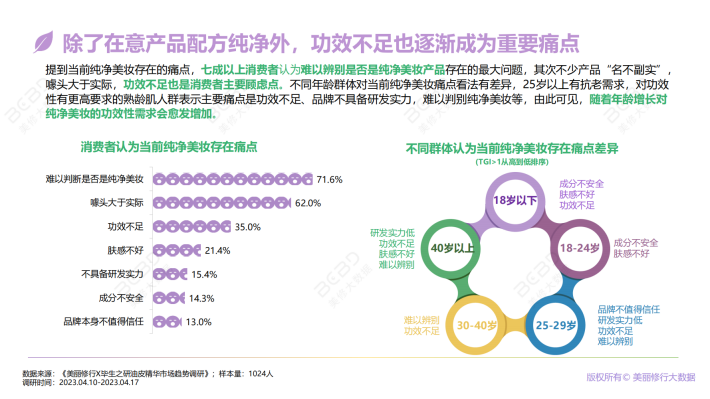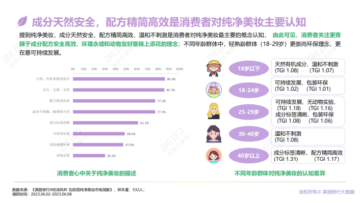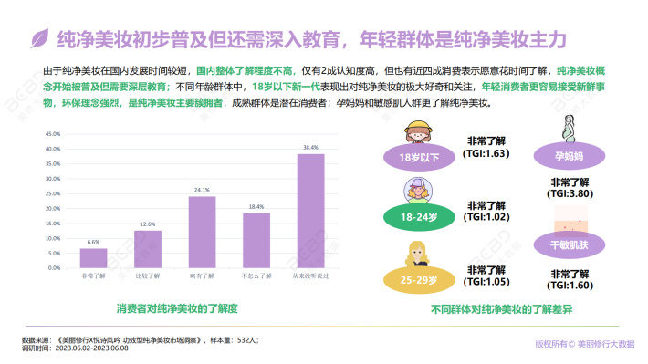 由于纯净美妆在国内发展时间较短,国内整体了解程度不高,仅有2成认知度高,但也有近四成消费表示愿意花时间了解,纯净美妆概念开始被普及但需要深层教育;不同年龄群体中,18岁以下新一代表现出对纯净美妆的极大好奇和关注,年轻消费者更容易接受新鲜事物,环保理念强烈,是纯净美妆主要簇拥者,成熟群体是潜在消费者;孕妈妈和敏感肌人群更了解纯净美妆。