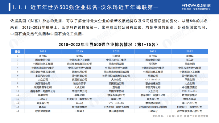 依据美国《财富》杂志的数据,可以了解全球最大企业的最新发展趋势以及公司经营质量的变化。从近5年的排名来看,2018-2022年榜单上,沃尔玛连续排名第一,常驻前五的公司有三家,均是中国的企业,分别是国家电网、中国石油天然气集团和中国石油化工集团。