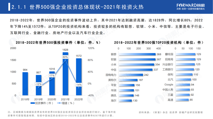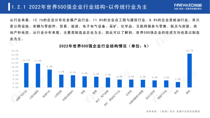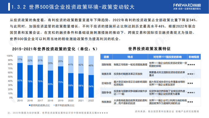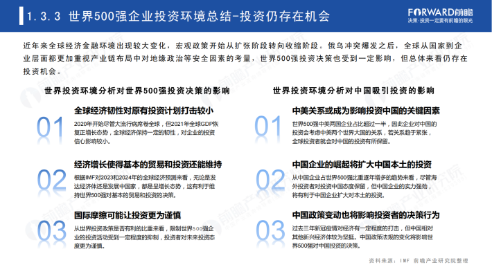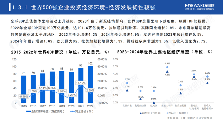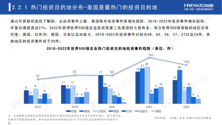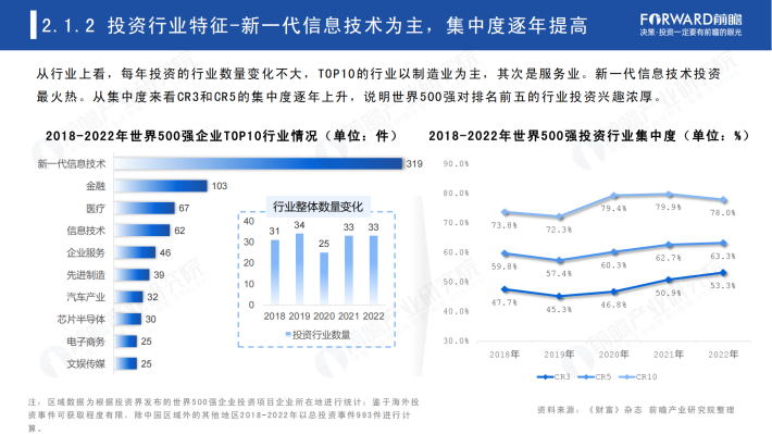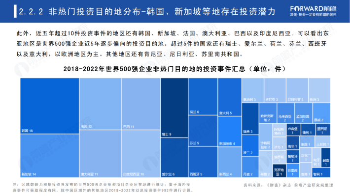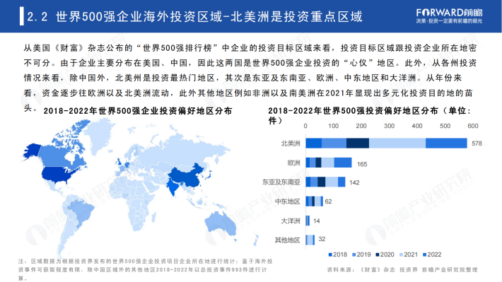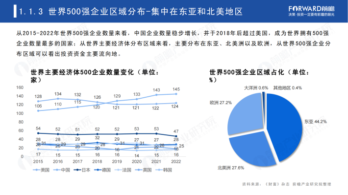 从2015-2022年世界500强企业数量来看,中国企业数量稳步增长,并于2018年后超过美国,成为世界拥有500强企业数量最多的国家;从世界主要经济体分布区域来看,主要分布在东亚、北美洲以及欧洲,从世界500强企业分布区域可以看出投资资金主要流向地。