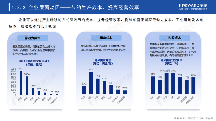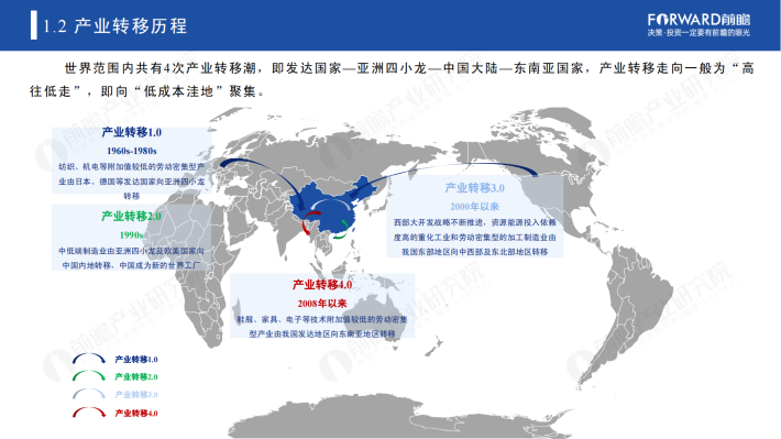 世界范围内共有4次产业转移潮,即发达国家—亚洲四小龙—中国大陆—东南亚国家,产业转移走向一般为“高往低走”,即向“低成本洼地”聚集。