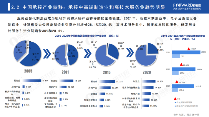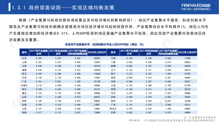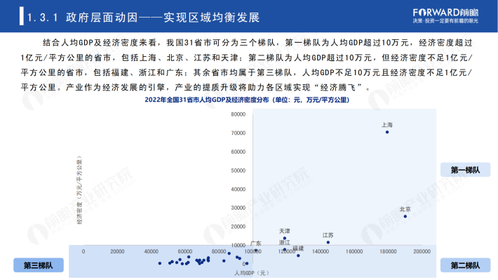 结合人均GDP及经济密度来看,我国31省市可分为三个梯队,第一梯队为人均GDP超过10万元,经济密度超过1亿元/平方公里的省市,包括上海、北京、江苏和天津;第二梯队为人均GDP超过10万元,但经济密度不足1亿元/平方公里的省市,包括福建、浙江和广东;其余省市均属于第三梯队,人均GDP不足10万元且经济密度不足1亿元/平方公里。产业作为经济发展的引擎,产业的提质升级将助力各区域实现“经济腾飞”。