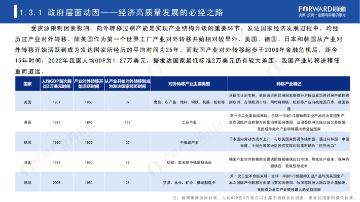 受资源限制因素影响,向外转移过剩产能是实现产业结构升级的重要环节,发达国家经济发展过程中,均经历过产业对外转移。除英国作为第一个世界工厂产业对外转移开始相对较早外,美国、德国、日本和韩国从产业对外转移开始活跃到成为发达国家所经历的平均时间为25年。而我国产业对外转移起步于2008年金融危机后,距今15年时间,2022年我国人均GDP为1.27万美元,据发达国家最低标准2万美元仍有较大差距,我国产业转移进程任重而道远。