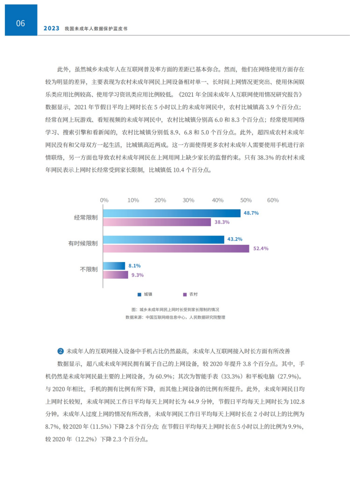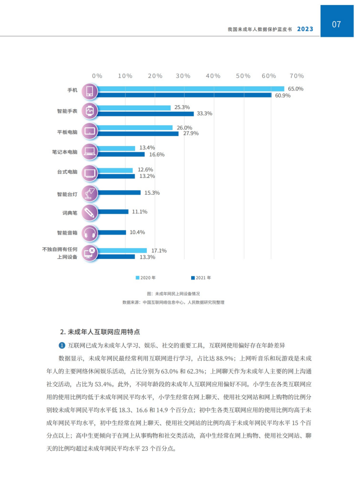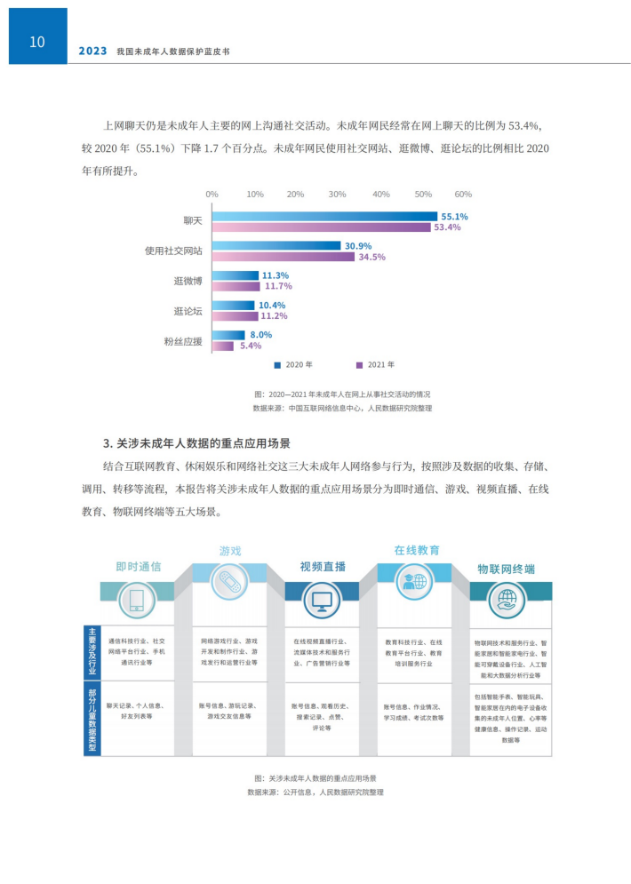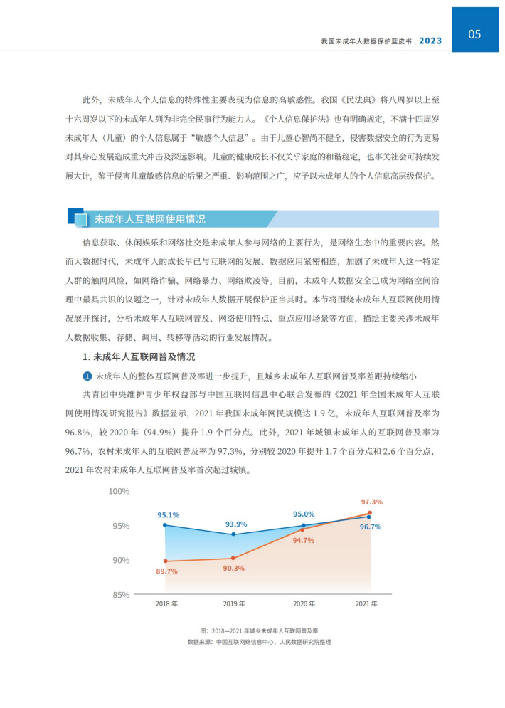 信息获取、休闲娱乐和网络社交是未成年人参与网络的主要行为,是网络生态中的重要内容。然而大数据时代,未成年人的成长早已与互联网的发展、数据应用紧密相连,加剧了未成年人这一特定人群的触网风险,如网络诈骗、网络暴力、网络欺凌等。目前,未成年人数据安全已成为网络空间治理中最具共识的议题之一,针对未成年人数据开展保护正当其时。本节将围绕未成年人互联网使用情况展开探讨,分析未成年人互联网普及、网络使用特点、重点应用场景等方面,描绘主要关涉未成年人数据收集、存储、调用、转移等活动的行业发展情况。