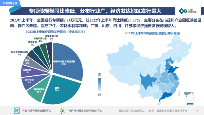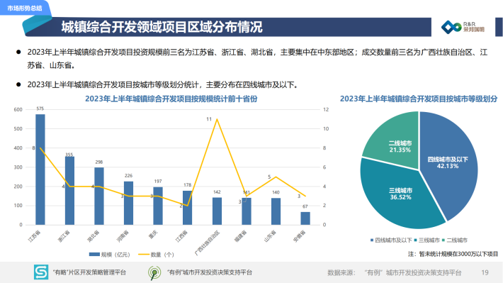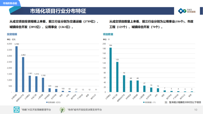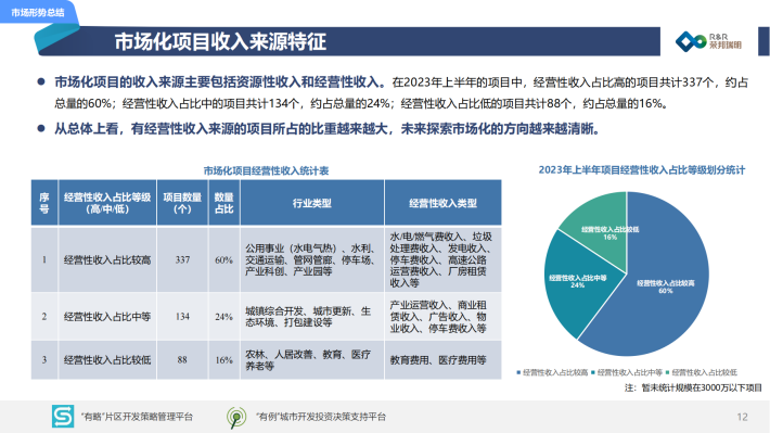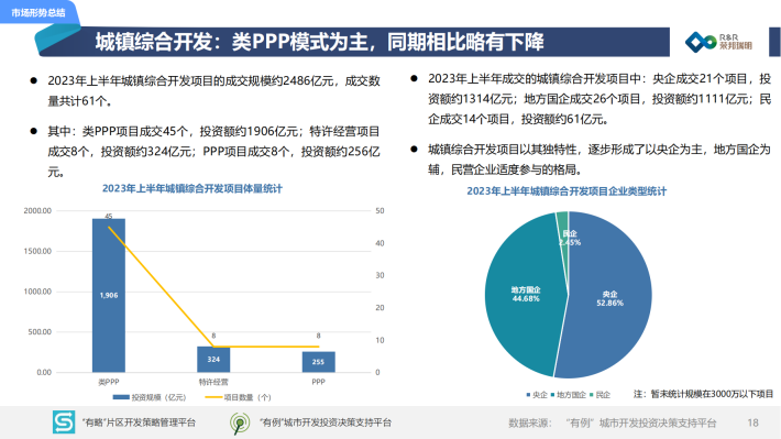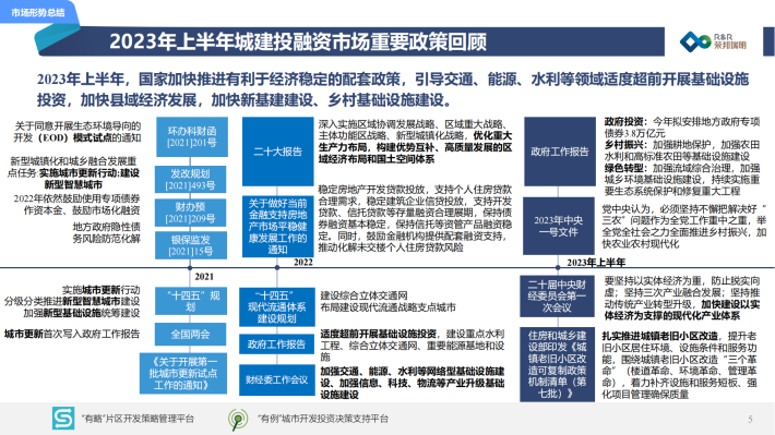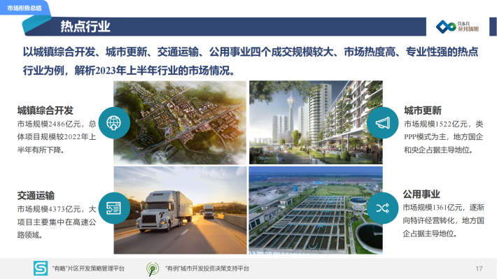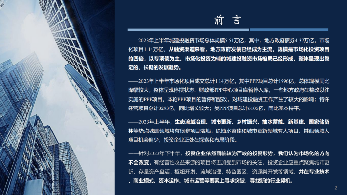针对2023年下半年,投资企业依然面临较为严峻的投资形势,我们认为市场化的方向不会改变,有经营性收益来源的项目将更加受到市场的关注,投资企业应重点聚焦城市更新、存量资产盘活、枢纽开发、流域治理、特色园区、资源类开发等领域,并在专业技术、商业模式、资本运作、城市运营等要素上寻求突破,寻找新的行业契机。