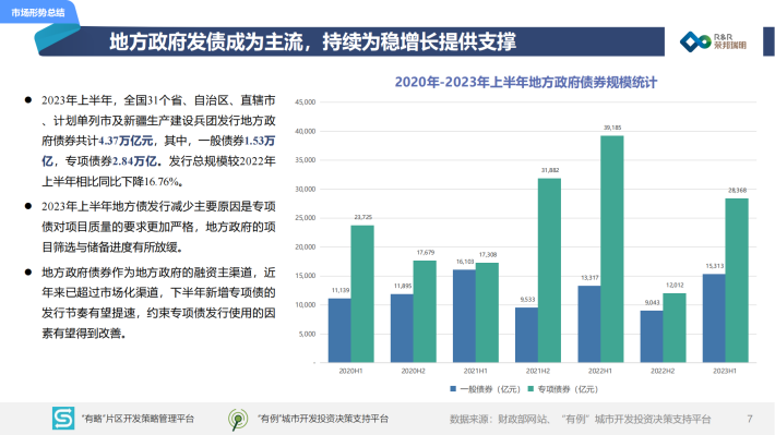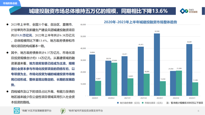 2023年上半年城建投融资市场总体规模5.51万亿,其中,地方政府债券4.37万亿,市场化项目1.14万亿,从融资渠道来看,地方政府发债已经成为主流,规模是市场化投资项目的四倍,以专项债为主、市场化投资为辅的城建投融资市场格局已经形成,整体呈现出稳定的、长期的发展趋势。