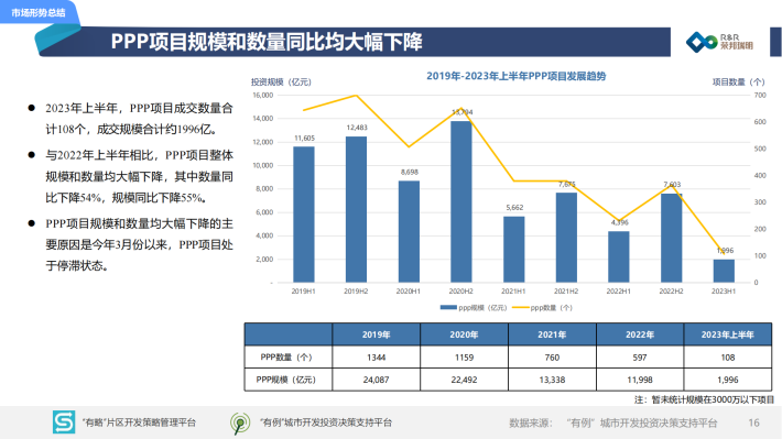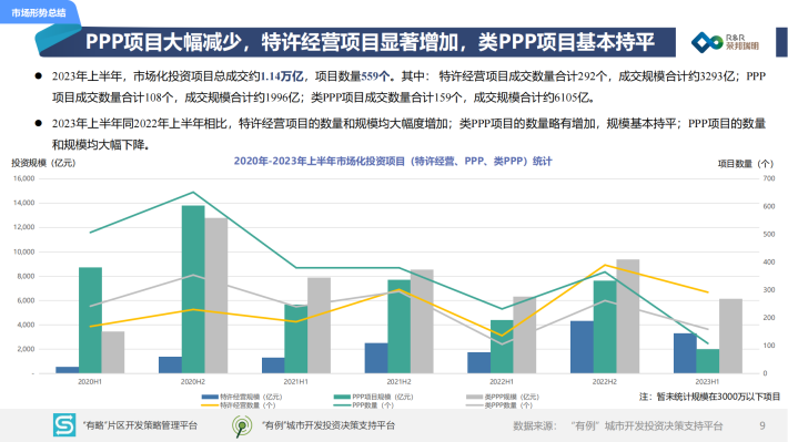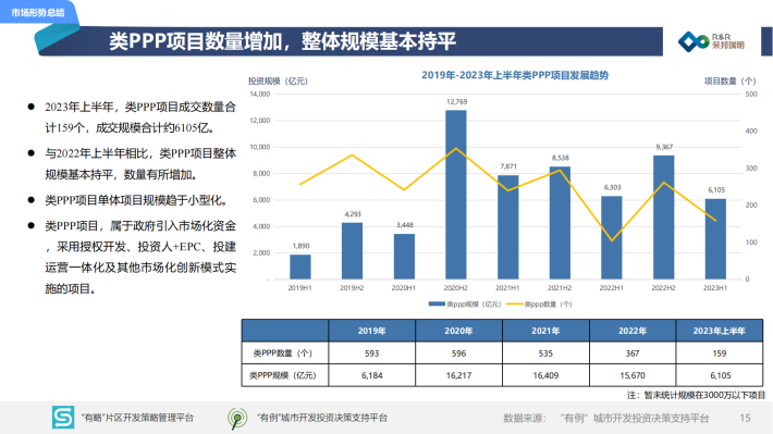 2023年上半年市场化项目成交总计1.14万亿,其中PPP项目总计1996亿,总体规模同比降幅较大,整体呈现停摆状态,财政部PPP中心项目库暂停入库,一些地方政府在整改以往实施的PPP项目,本轮PPP项目的暂停和整改,对城建投融资工作产生了较大的影响;特许经营项目总计3293亿,同比增长较大;类PPP项目总计6105亿,同比基本持平。