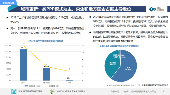 2023年上半年,生态流域治理、城市更新、乡村振兴、抽水蓄能、新基建、国家储备林等热点城建领域均有很多项目落地,除抽水蓄能和城市更新领域有大项目,其他领域大项目机会偏少,投资企业正处在探索和布局阶段。
