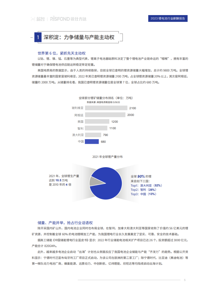 美国地质局的数据显示,由于人类的持续勘探,目前全球已查明的锂资源储量大幅增加,总计约9800万吨。全球锂资源储量最丰富的国家是玻利维亚,2022年其已查明锂资源储量2100万吨,占全球锂资源储量20%以上,其次是阿根廷,储量约2000万吨。从储量排名看,我国已查明锂资源储量位居全球第7位,全球占比约680万吨。