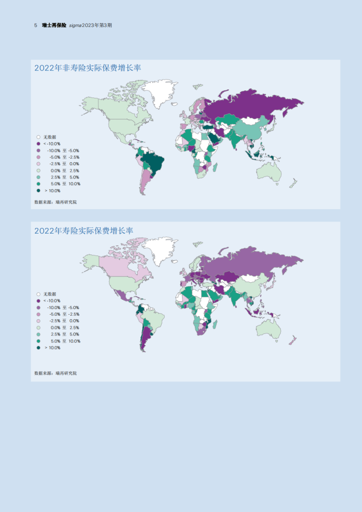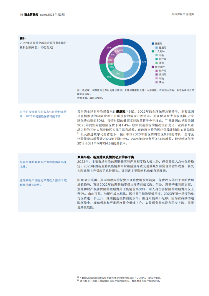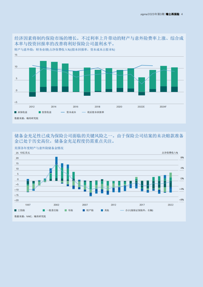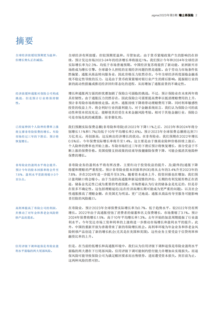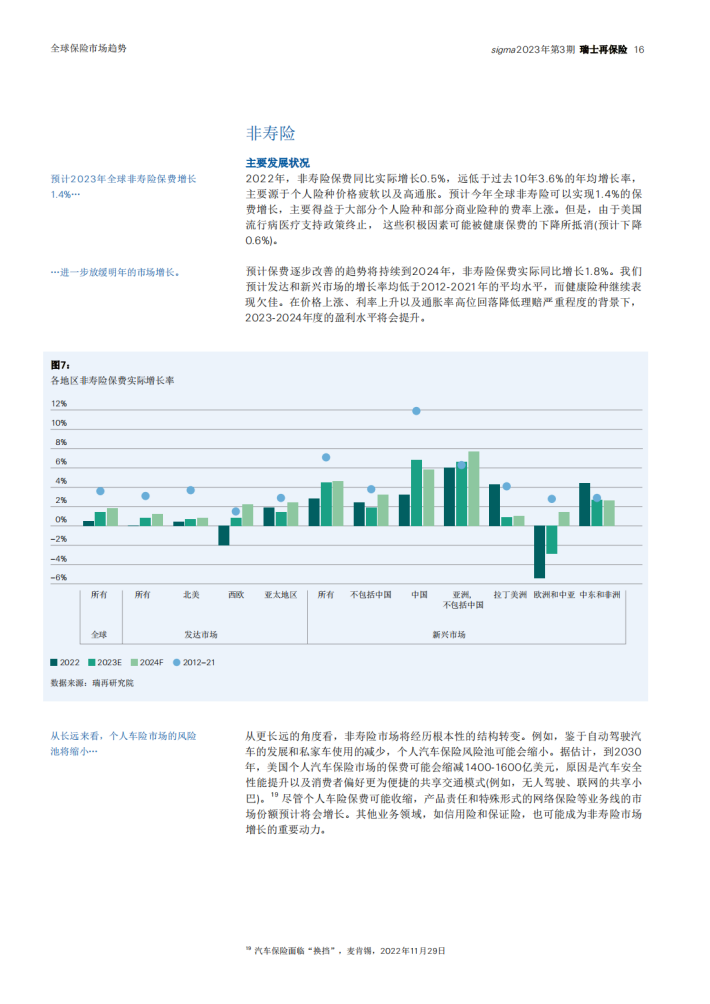 我们预测实际保费总额(非寿险和寿险)在2022年下降1.1%之后,2023年和2024年将分别增长1.1%和1.7%(均低于10年平均增长率2.6%)。预计2023年全球保费总额将达到7.1万亿美元,再创新高,这反映出经济增长的扰动。在非寿险业,我们预期在2022年增长0.5%后,今年保费实际增长率将升至1.4%。这主要是由于继商业险种价格持续上涨后,个人险种的费率也开始上涨。车险市场经过三年的下滑后预计将恢复增长,部分受益于不断上涨的保费价格。美国疫情支持政策的结束导致健康险保费下降,可能会抵消其他险种保费的增长。
