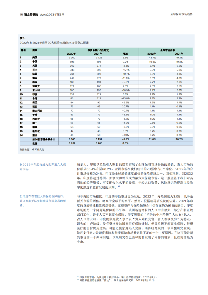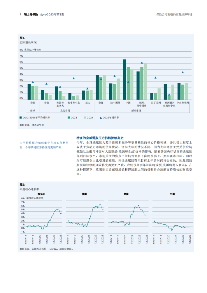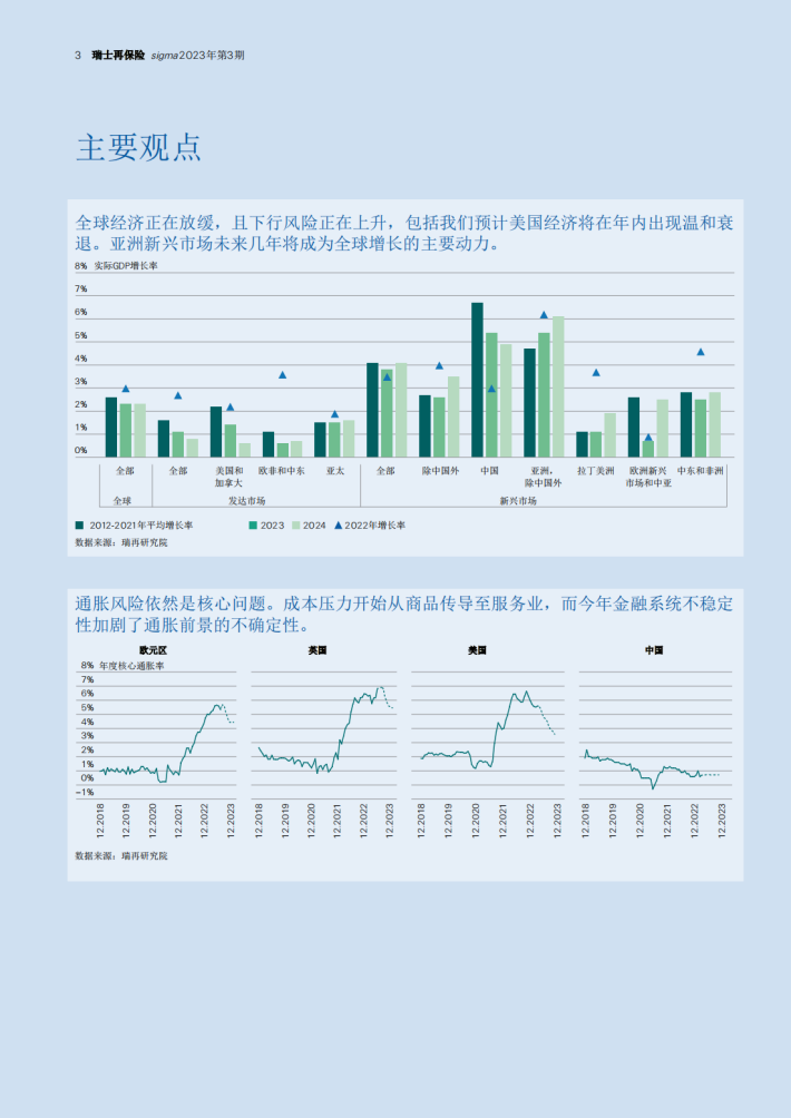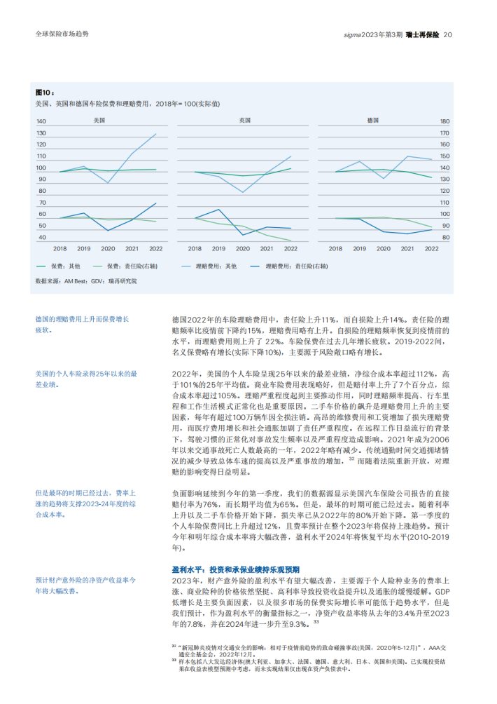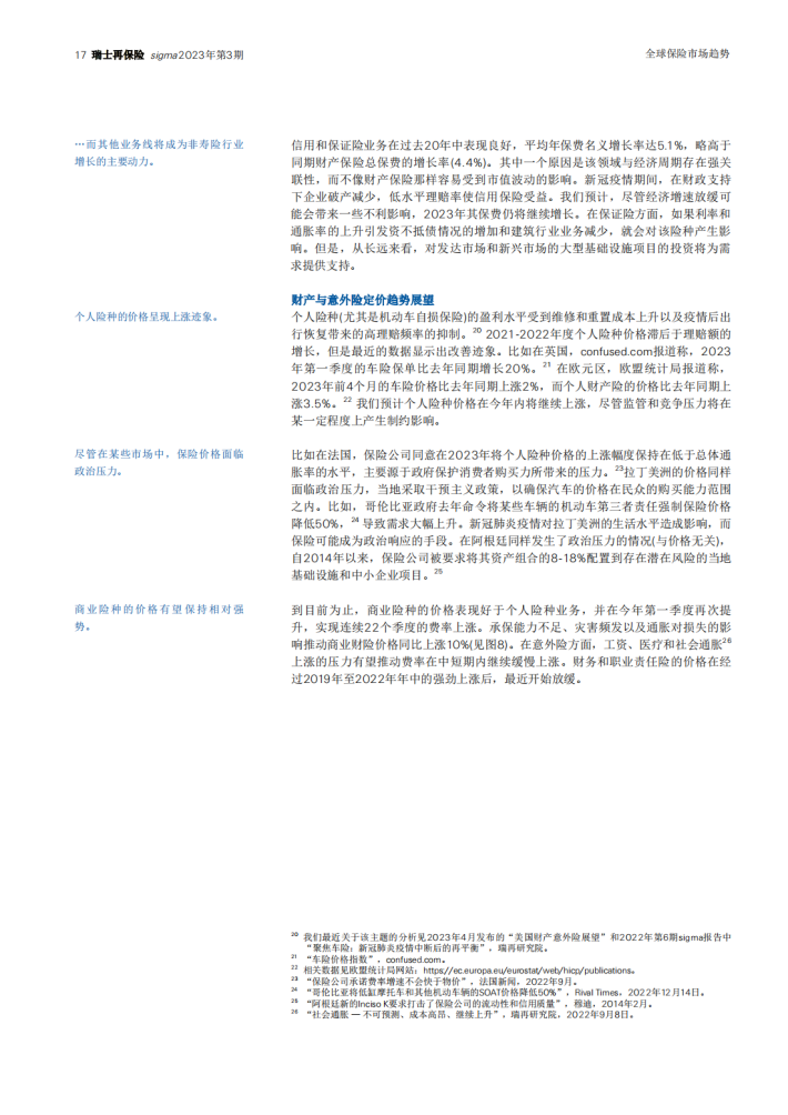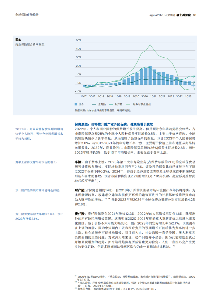 我们预测实际保费总额(非寿险和寿险)在2022年下降1.1%之后,2023年和2024年将分别增长1.1%和1.7%(均低于10年平均增长率2.6%)。预计2023年全球保费总额将达到7.1万亿美元,再创新高,这反映出经济增长的扰动。在非寿险业,我们预期在2022年增长0.5%后,今年保费实际增长率将升至1.4%。这主要是由于继商业险种价格持续上涨后,个人险种的费率也开始上涨。车险市场经过三年的下滑后预计将恢复增长,部分受益于不断上涨的保费价格。美国疫情支持政策的结束导致健康险保费下降,可能会抵消其他险种保费的增长。