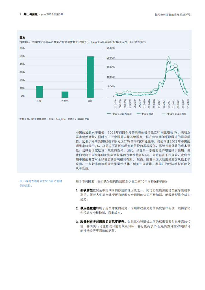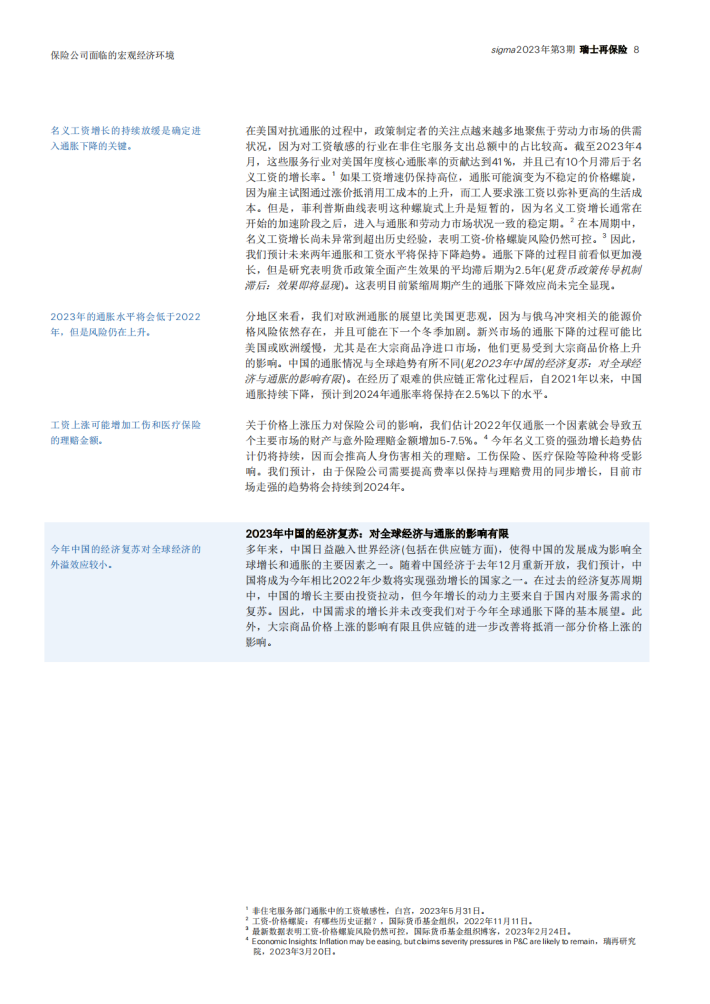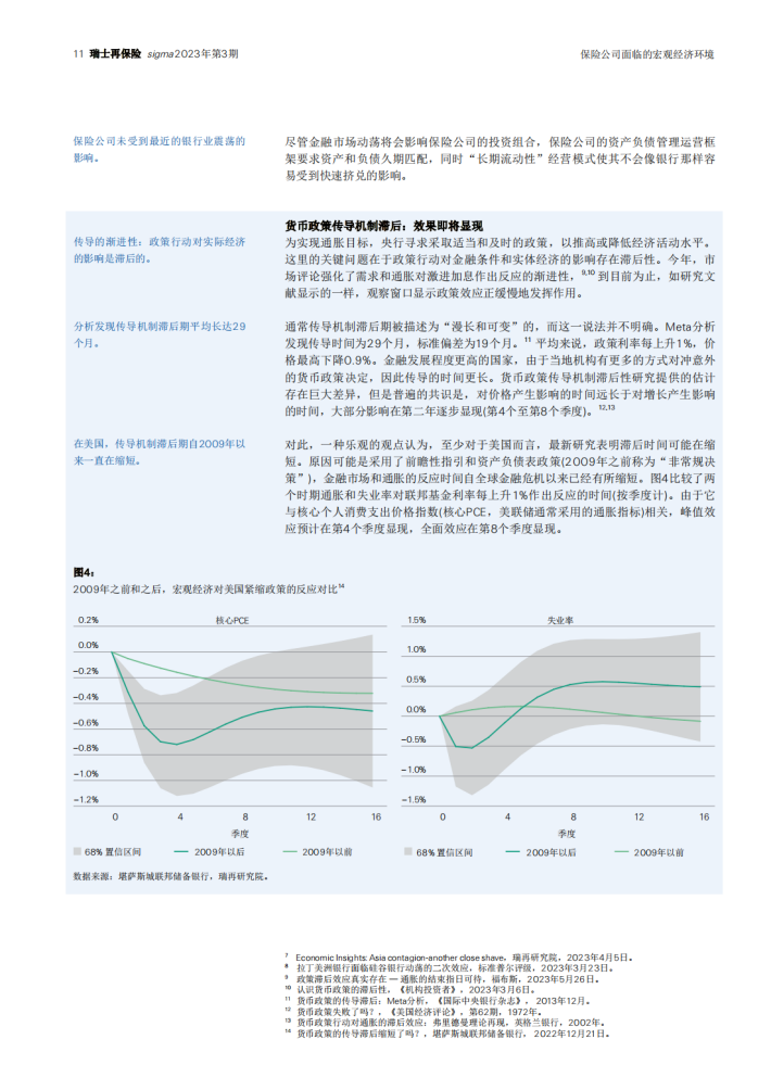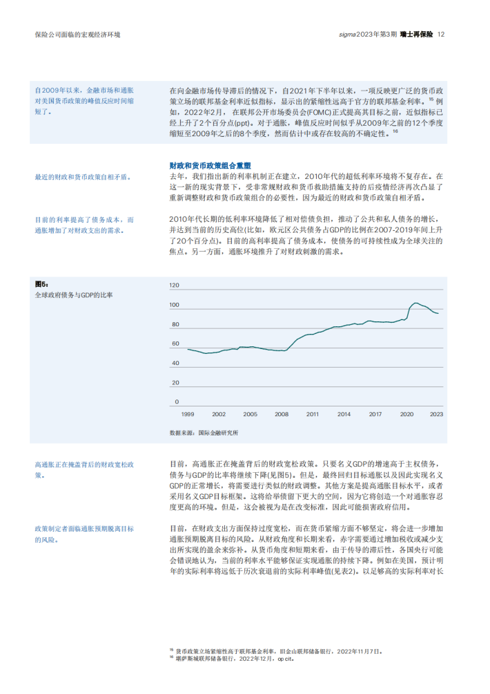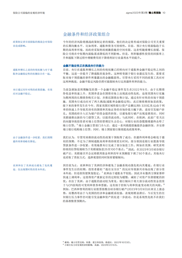 增长和通胀两方面的担忧都加剧了保险公司面临的挑战。不过,预计保险业在未来两年将具有韧性。由于通胀压力仍然存在,因此保险公司需要提高费率以抵消理赔费用的上升,预计非寿险市场将继续走强。此外,通胀持续下降将带动理赔费用下降,同时利率敏感性投资的收益上升,将会利好行业的盈利能力。对于金融系统而言,我们认为保险公司的流动性和资本状况充足,能够使其经受住未来金融风险考验。相对于其他金融行业,保险公司是市场危机的减震器,而非催化剂。