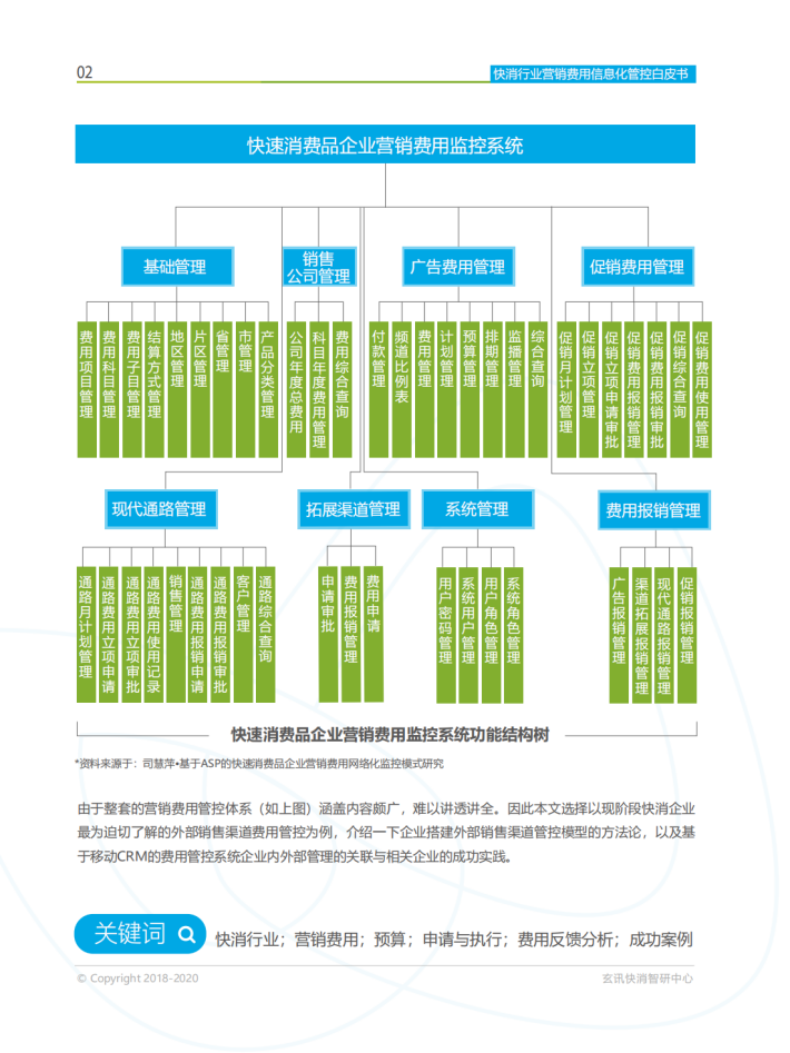 快消企业营销费用管控系统囊括的对象是广泛而复杂的,从基础管理、促销费用、到现代通路、费用报销等多个方面。绝大多数的快消企业都有自己的财务管理系统,以处理企业的日常财务费用相关事项。但就庞大的企业费控全体系来看,财务系统只是其中的一个小部分,目前大部分快消企业所理解与拥有的“费用管控系统”是狭义的,实际上并不涉及对企业外部销售渠道(终端门店、经销商等)费用的具体管控。