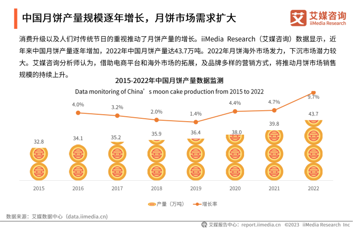 数据显示,2015-2022年,中国月饼产量逐年增加,从32.8万吨增长到43.7万吨。2022年月饼海外市场发力,下沉市场潜力较大。艾媒咨询分析师认为,随着消费者月饼口味多元化,节日送礼需求增长以及销售渠道如新兴直播电商平台范围的扩大,覆盖人群更加广泛,月饼市场有望迎来新突破,预计2025年月饼礼盒市场规模达247.0亿元。