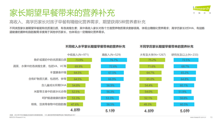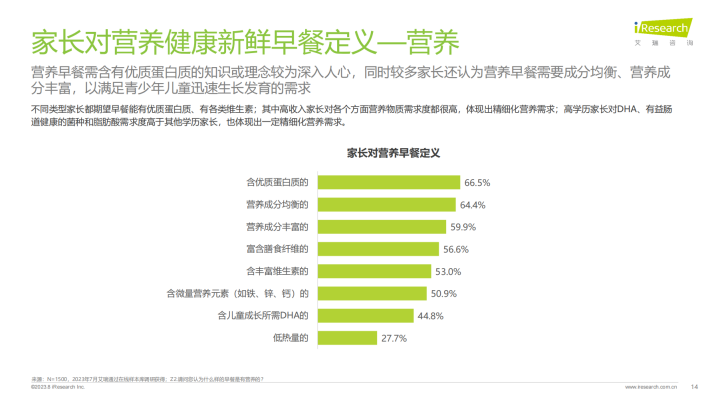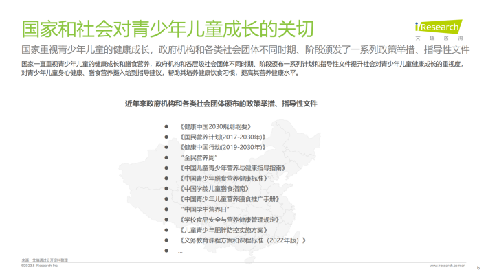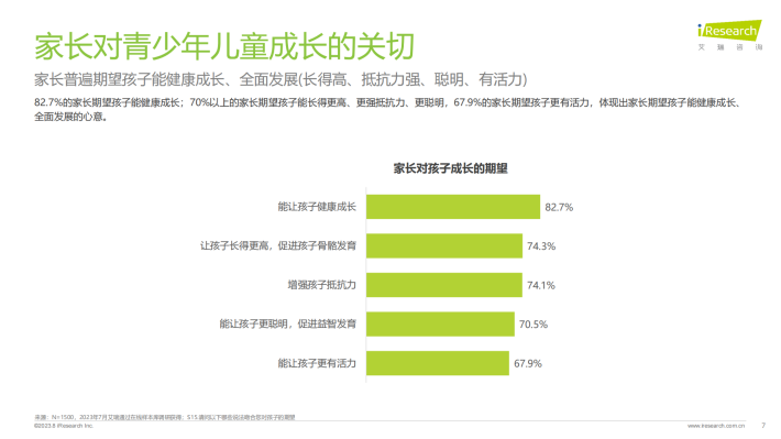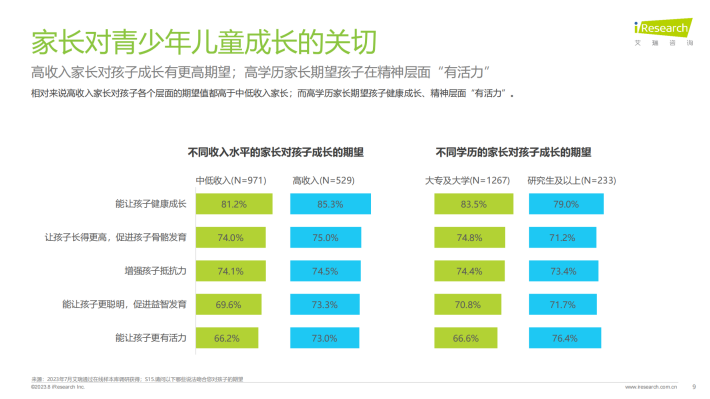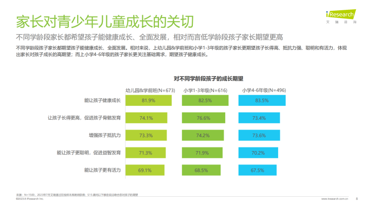 国家一直重视青少年儿童的健康成长、膳食营养,颁布一系列政策举措、指导性文件。家长对孩子成长充满殷切期望,希望其健康成长、全面发展(长得高、抵抗力强、聪明、有活力),特别是低学龄段孩子家长和高收入家长;而高学历家长更期望孩子在精神层面“有活力”