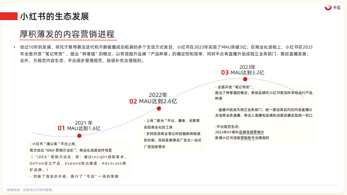 经过10年的发展,依托于推荐算法迭代和不断破圈成功拓展的多个生活方式类目,小红书在2023年实现了MAU突破3亿;在商业化进程上,小红书在2023年全面开放"笔记带货”,提出“种草值"的概念,以有效提升品牌「产品种草」的确定性和效率,同时平台将直播升级成独立业务部门,推动直播发展;此外,为规范内容生态,平台逐步管理规范,陆续补充治理规则。