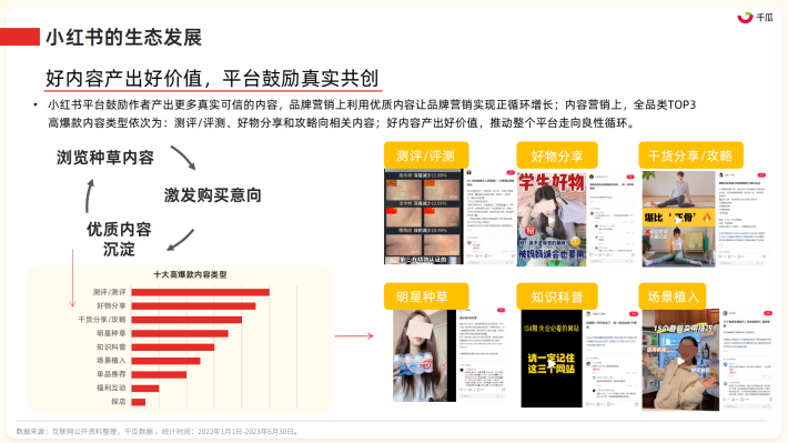 小红书平台鼓励作者产出更多真实可信的内容,品牌营销上利用优质内容让品牌营销实现正循环增长;内容营销上,全品类TOP3高爆款内容类型依次为:测评/评测、好物分享和攻略向相关内容;好内容产出好价值,推动整个平台走向良性循环。