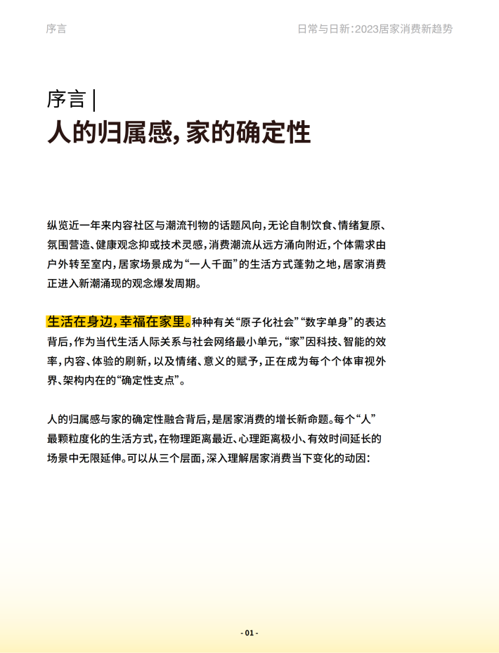 (1)新商业环境:技术驱动,更要温度。数字时代的新生活方式席卷每个行业,而越是科技大加速的不确定,人们越需要温度感与日常化的确定性。有温度有细节的商业与品牌,才能成为新消费者的应许之地,“离人最近”的居家消费当仁不当。