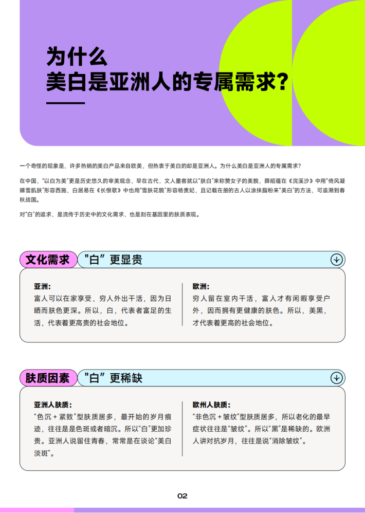 一白遮百丑。早在古代,中国的文人墨客就以“肤白”来称赞女子的美貌;实际在整个亚洲国家,白,都是一直以来的文化需求:因为白,代表着更高的社会地位和更富足的生活。这是过去式的美白。