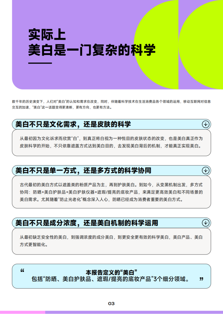 美白,是中国消费者最主要的两大护肤诉求之一,消费者的科学美白意识提升,美白需求进一步精细化,也推动着上游研发、化妆品品牌、自媒体内容创作者等行业参与者不断创新。