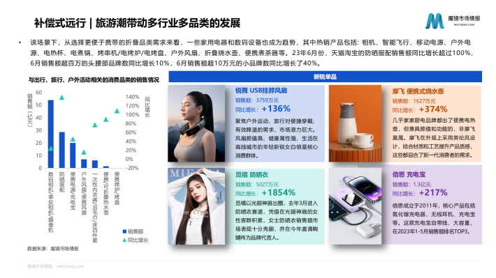 数字游民追求随时的工作状态和自在的工作环境,居家办公最受Z世代的数字游民所喜爱, “宅经济”加速兴起。Z世代年轻人期待不出门就能享受到最舒适的环境、最智能便捷的体验、最轻松的生活氛围。于是,年轻人开始购置智能办公产品,包括轻薄笔记本、轻薄鼠标移动电源、平板电脑、随身Wi-Fi、手指鼠标。其中有明显增长的主要为便携平板电脑以及外设的小型电脑办公辅助设备如无线鼠标、移动硬盘和耳机等等。23年6月份,天猫淘宝的笔记本电脑的销售额同比增长10%,移动电源销售额同比增长超过30%,手指鼠标销售额同比增长50%。