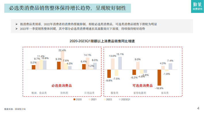 按消费品类别看,2022年消费者的消费热情被抑制,相较必选类消费品,可选类消费品销售下滑较为明显2023年一季度销售整体回暖,其中部分必选类消费增速在高基数效应下放缓,持续保持较好趋势