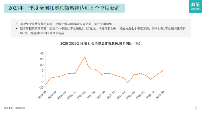 随着防控政策的调整,2023年一季度社零总额达11.5万亿元,同比增长5.8%,增速为近七个季度新高。其中3月社零总额同比增长10.6%,增速为2021年7月以来新高