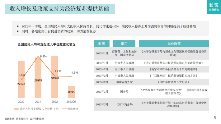 2023年一季度,全国居民人均可支配收入保持增长,同比增速达4.6%,居民收入稳步上升为消费市场的回暖提供了经济基础同时,各地密集出台促进消费的政策,助力消费复苏