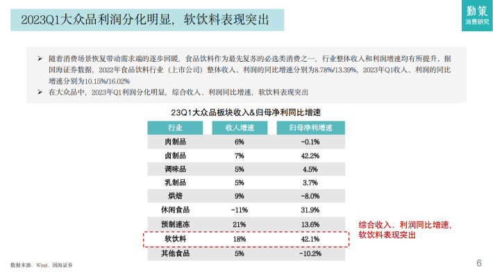 在大众品中,2023年Q1利润分化明显,综合收入、利润同比增速,软饮料表现突出