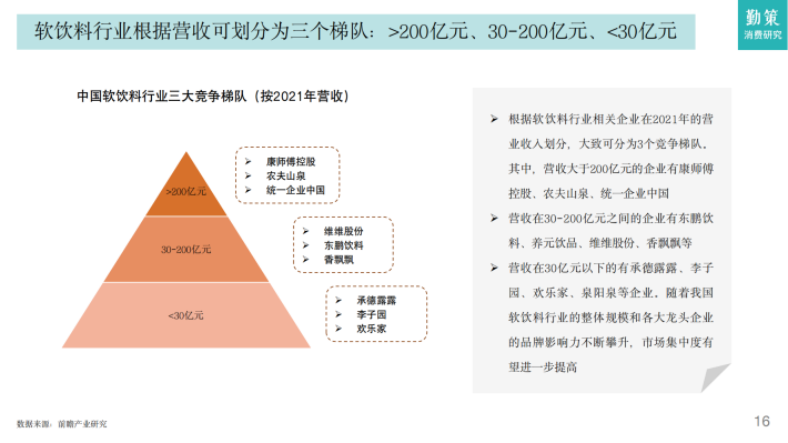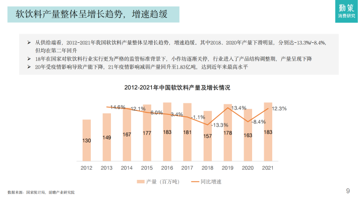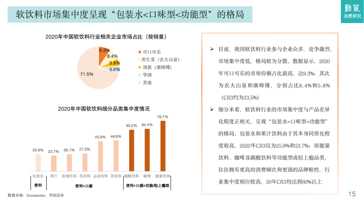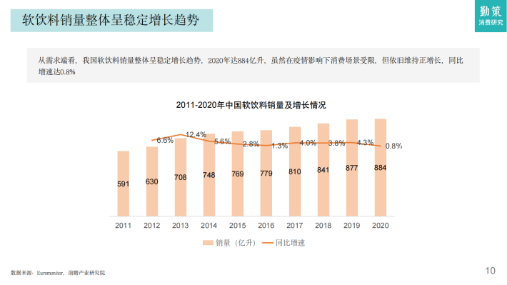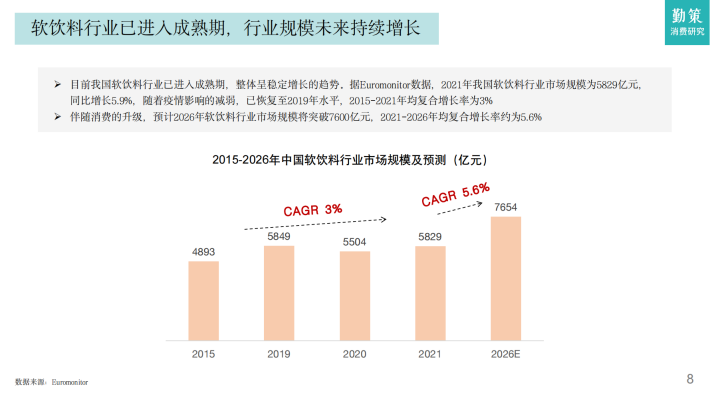 目前我国软饮料行业已进入成熟期,整体呈稳定增长的趋势。据Euromonitor数据,2021年我国软饮料行业市场规模为5829亿元,同比增长5.9%,随着疫情影响的减弱,已恢复至2019年水平,2015-2021年均复合增长率为3%伴随消费的升级,预计2026年软饮料行业市场规模将突破7600亿元,2021-2026年均复合增长率约为5.6%