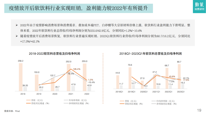 随着消费场景恢复带动需求端的逐步回暖,食品饮料作为最先复苏的必选类消费之一,行业整体收入和利润增速均有所提升。据国海证券数据,2022年食品饮料行业(上市公司)整体收入、利润的同比增速分别为8.78%/13.39%,2023年Q1收入、利润的同比增速分别为10.15%/16.02%