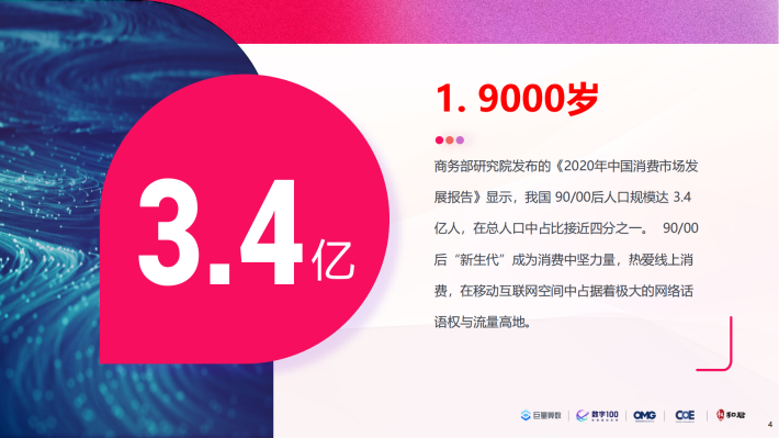 商务部研究院发布的《2020年中国消费市场发展报告》显示,我国90/00后人口规模达3.4亿人,在总人口中占比接近四分之一。 90/00后“新生代”成为消费中坚力量,热爱线上消费,在移动互联网空间中占据着极大的网络话语权与流量高地。