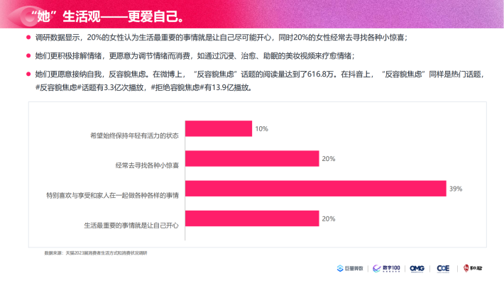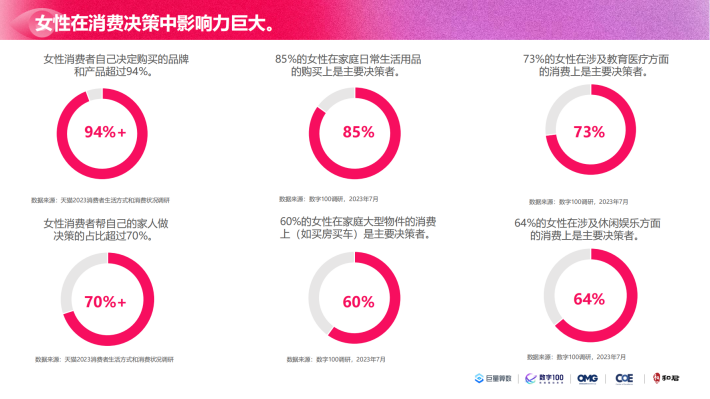 "她经济"愈加火热,女性消费力和对消费的影响力惊人。女性自身可支配收入逐年增加,与男性逐渐缩小。在家庭日常生活用品、家庭大型物件、教育医疗、休闲娱乐的消费方面,她们大部分是决策者,每年影响着超10万亿的消费支出,足以构成世界第三大消费市场。
